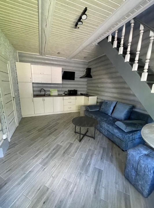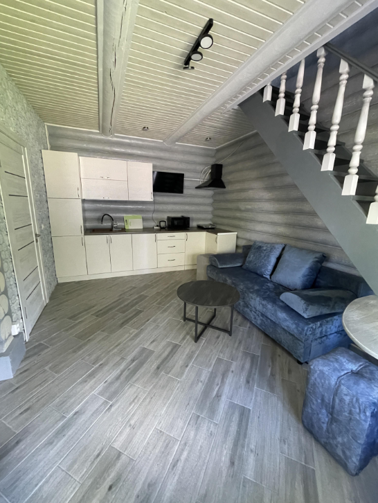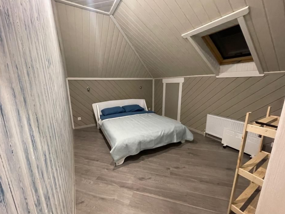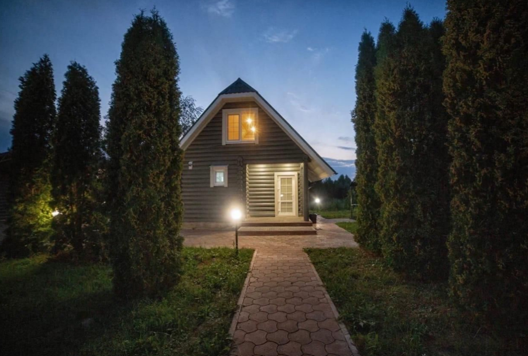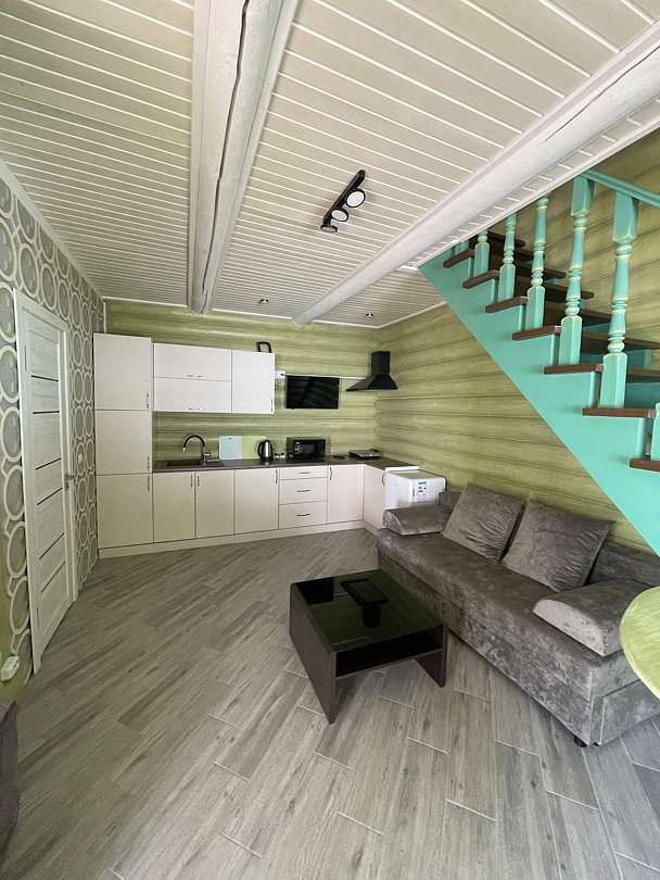 На втором этаже расположена большая кровать, на первом этаже — раскладной диван. Детская кроватка по запросу. В домике есть все необходимое: ТВ, СВЧ, кондиционер, холодильник, электрический чайник, индукционная плита, посуда для приготовления. На первом этаже расположена туалетная комната с душем. Рядом с домиком своя мангальная зона. В стоимость входит уголь, розжиг (по запросу).
