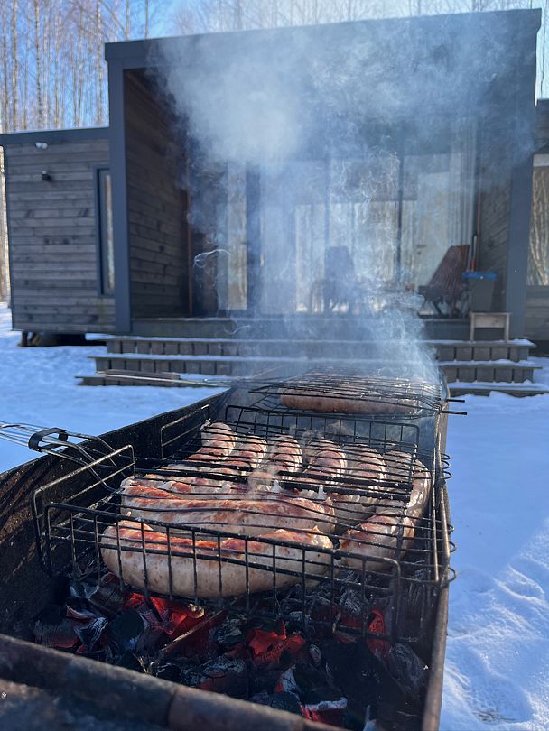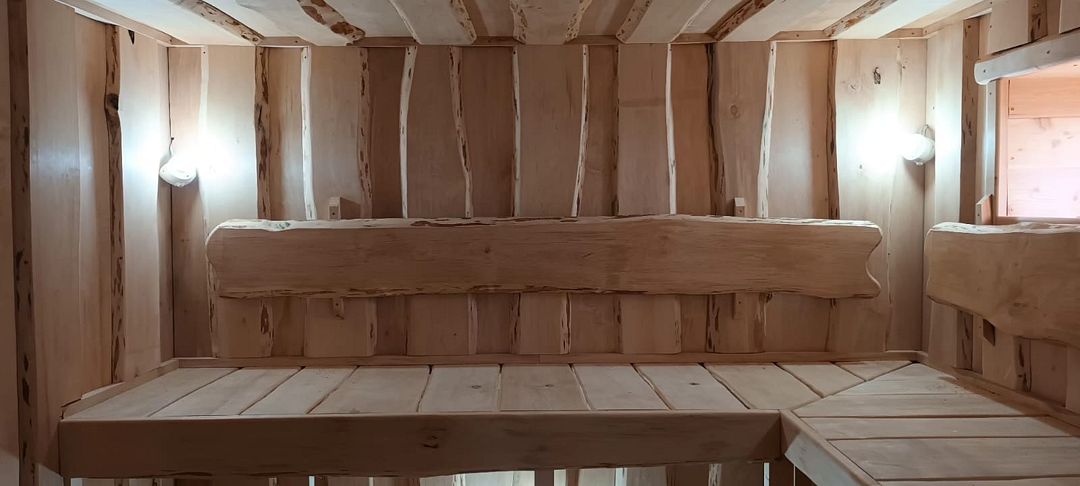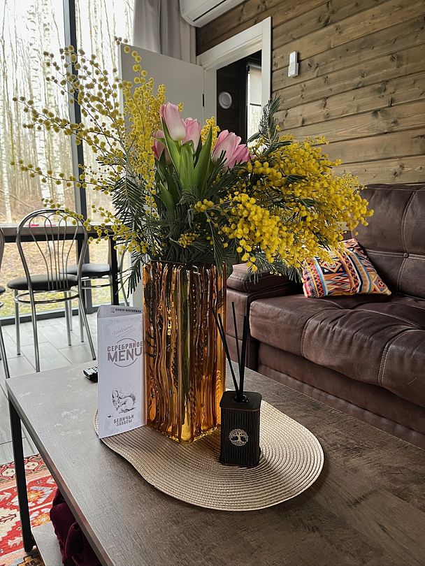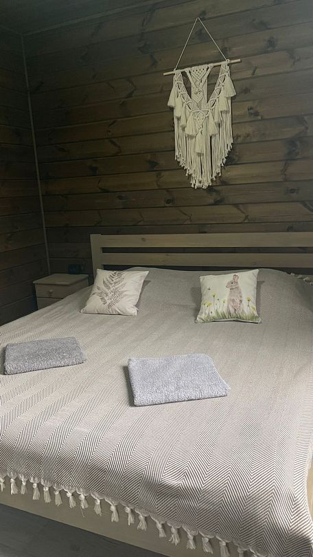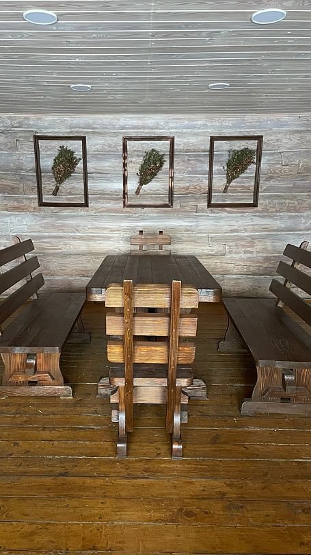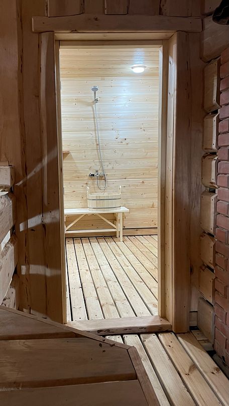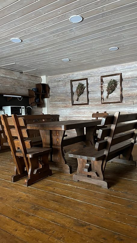 Дом прошел реновацию весной 2025 года. Первый этаж: гостиная с большим столом, телевизором и мини кухней - электроплита, микроволновая печь, большой холодильник, чайник, горячая вода, посуда для приготовления и сервировки. Баня в диком стиле из лиственницы и ольхи, с парилкой и помывочной.