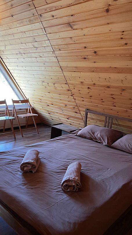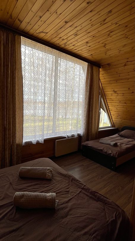 Второй этаж: три спальни с двуспальными кроватями и телевизорами. В двух комнатах дополнительно установлены односпальные кровати. Постельное белье и полотенца выдаются бесплатно.