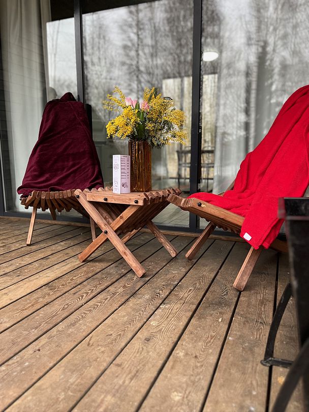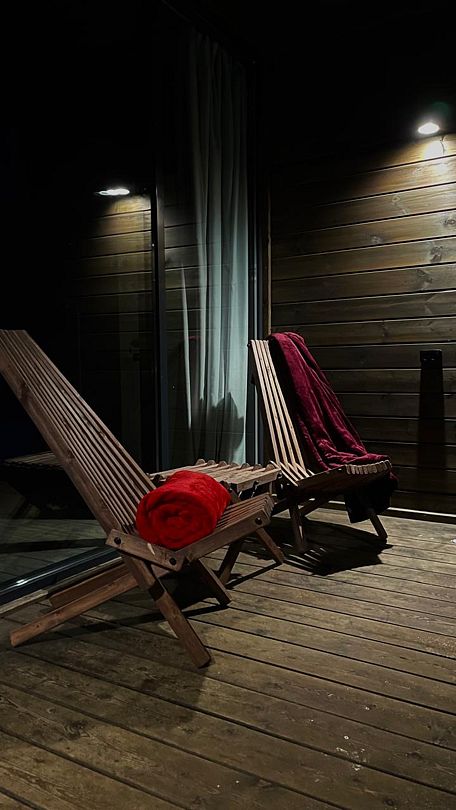 Шезлонги на террасе и теплый уютный плед – то, что нужно, чтобы насладиться отдыхом. Рядом с каждым гостевым домом расположена зона для барбекю и стоянка на три автомобиля (включены в стоимость проживания).