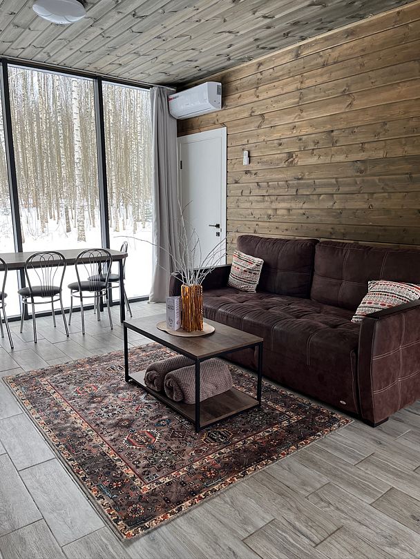 Каждый дом рассчитан на 6 гостей, а если планируется больше – площадь дома позволяет и это. Уютная гостиная с панорамным видом на березовую рощу и реку Десна. Кухня со всем необходимым, большой стол для дружной компании и зона отдыха, где найдется местечко и для домашних любимцев. В каждом доме три спальни с двуспальными кроватями и удобными ортопедическими матрасами. Мы позаботились, чтобы в каждом гостевом доме было все необходимое для комфортного проживания.