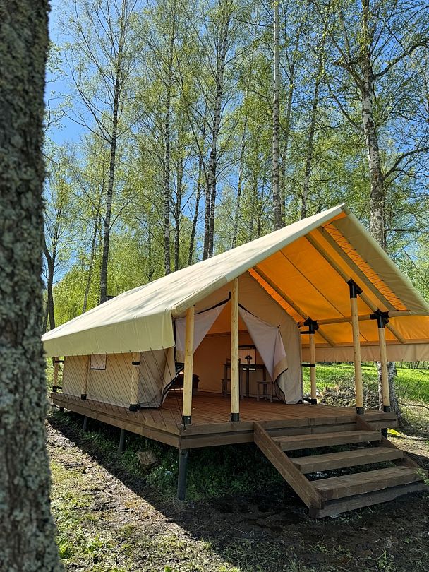 Семейный отдыхДостоинстваОтличная территория и выбор время препровождения. Отдыхали в Глемпинге, очень понравилось. В палатках есть свет, стол, «шкаф» мангал. Рядом река. Много мест для досуга. Хочешь палатку - пожалуйста, хочешь в люкс - подалуйста. На любой вкус домики. Удобный выход к реке, есть сапы, катамараны. Есть кафе. И очень хороший туалет, если вы приезжаете в Глемпинг или с палаткой. Отдыхом очень довольны.