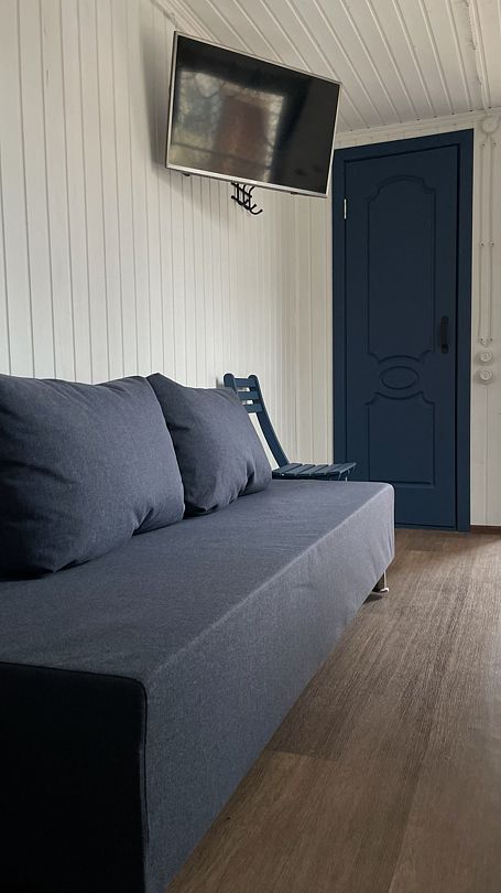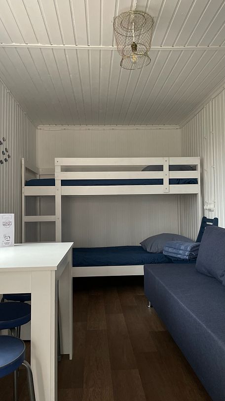 Двухкомнатный домик с душем, холодильником, телевизором, микроволновой печью, чайником и электроплиткой. двуспальная кровать и три односпальных места.