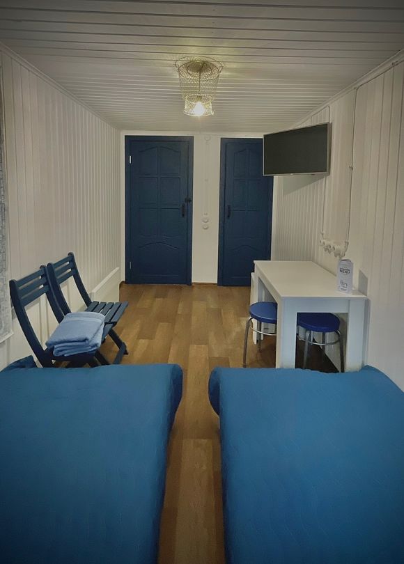 Номер в домике с 3 спальными местами, плоским телевизором и небольшим холодильником. Бесплатно выдается постельное белье и полотенца, а так же электрочайник и электроплитка. В санузле есть раковина с холодной водой и унитаз. У каждого номера есть мангал и стол на улице