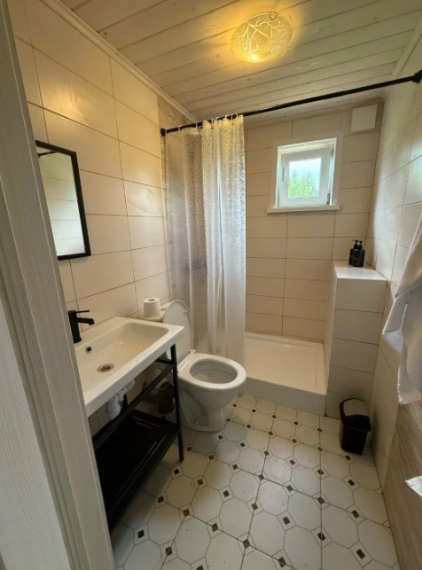 В номере (20 кв.м): двуспальная кровать, постельное бельё, электричество, холодильник, электрочайник, посуда, стол, стулья, кресла, мангал. Санузел в 50 метрах (горячая вода, душ, туалет).