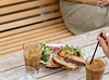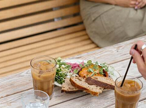 Кафе стоит прямо на берегу. Столики — на траве, на террасе, а в хороший день — даже на пирсе. Чай и кофе — бесплатные, просто надо подойти и налить. А если хочется чего-то особенного — ароматный кофе в зёрнах можно купить за стойкой пляжного бара (он там же, в кафе).