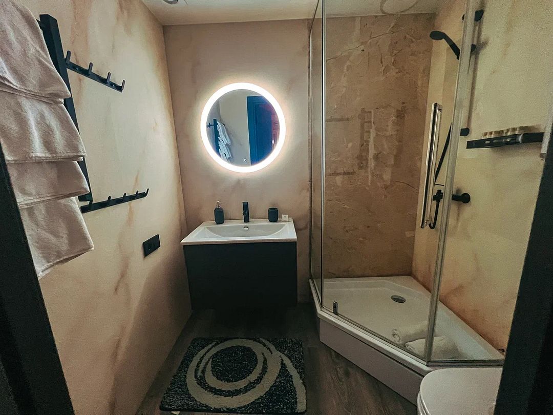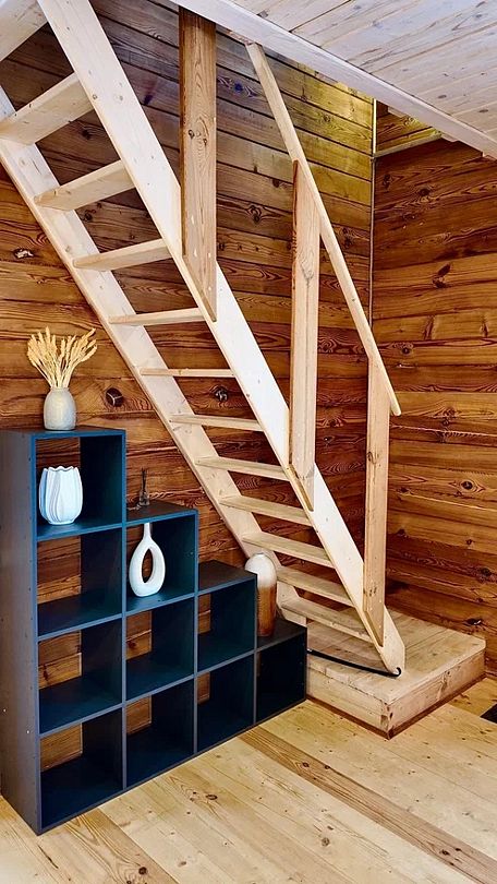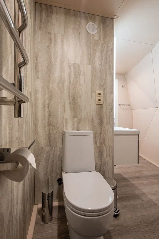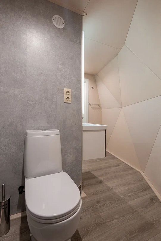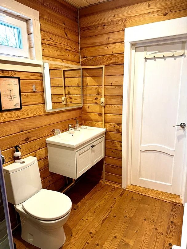 Изюминка снаружи — уютная, утопающая в зелени терраса, на которой установлена собственная большая японская купель Фурако на 6 человек и шезлонги. Представьте, в паре метров от дома личный горячий “бассейн” с пляжем и персональным печником!