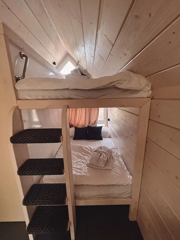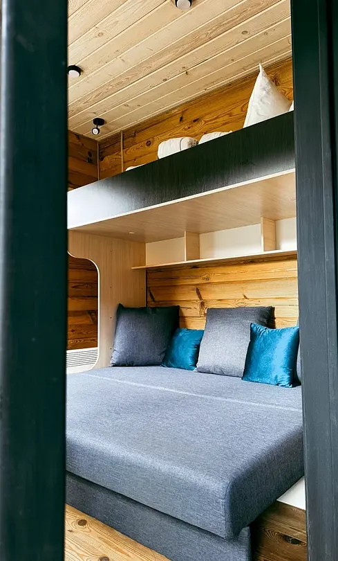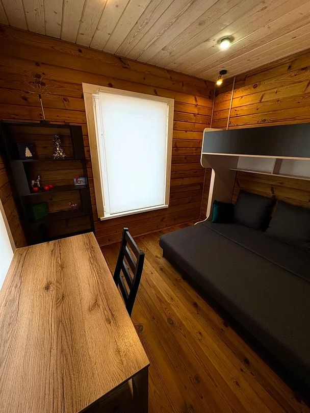 - Три спальных места: двуспальная кровать внизу, полутороспальная кровать наверху, для двух детей;