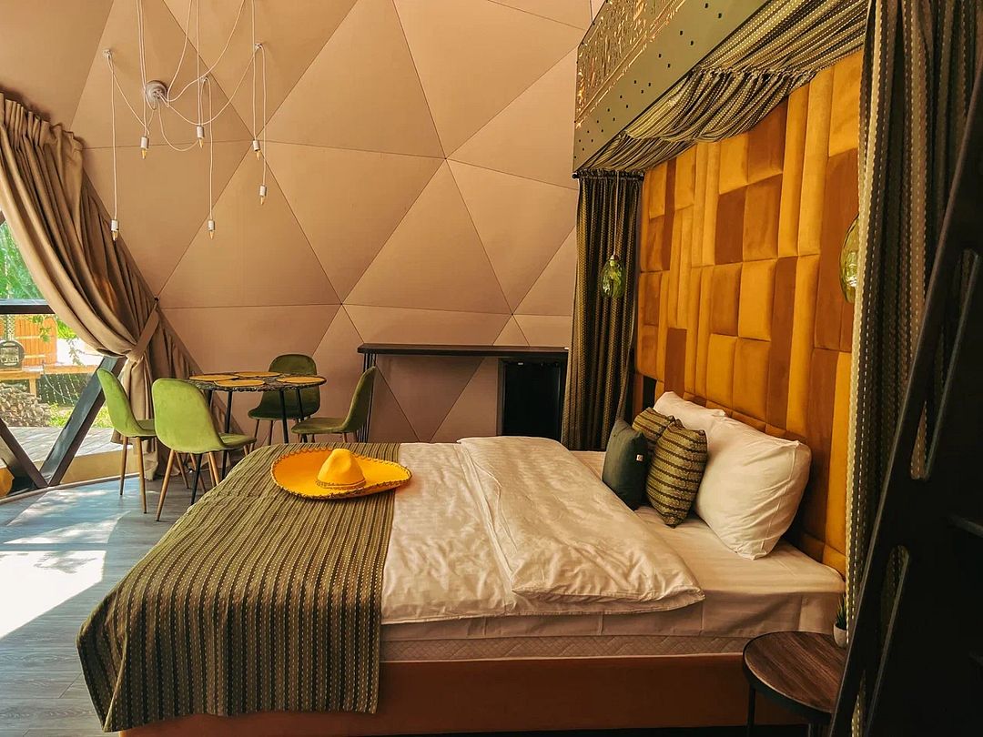 Геокупол Сьют «Жаркая Мексика» — это один из семи видов наших уникальных купольных домов. Дом имеет просторную комнату с огромной кроватью напротив панорамного окна и очень необычный мезонин на втором этаже.