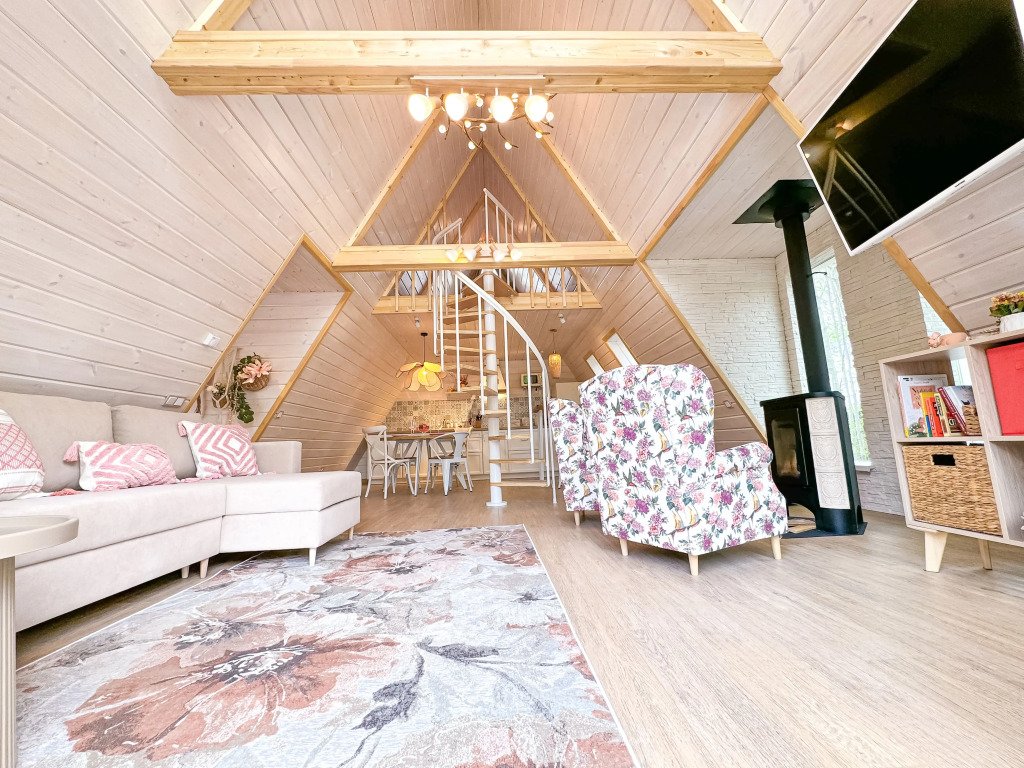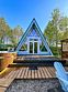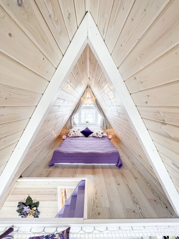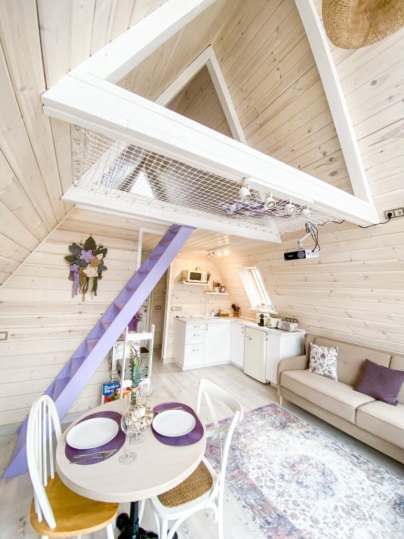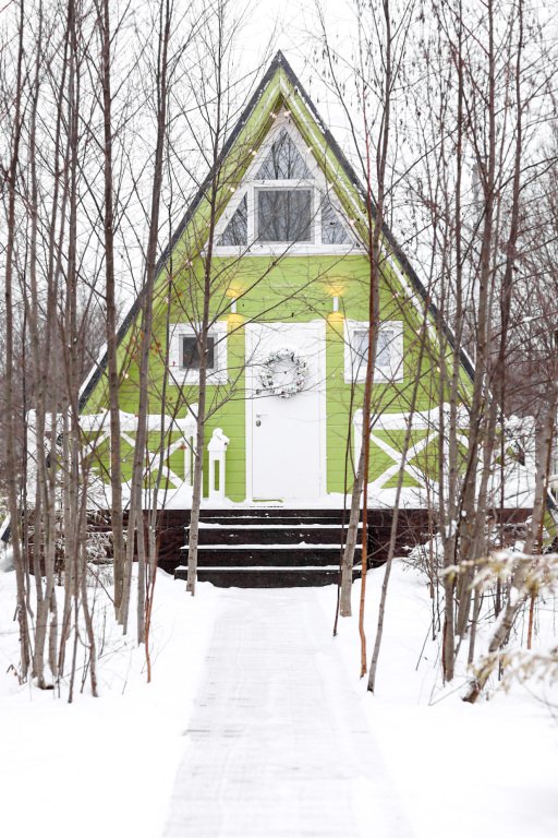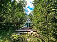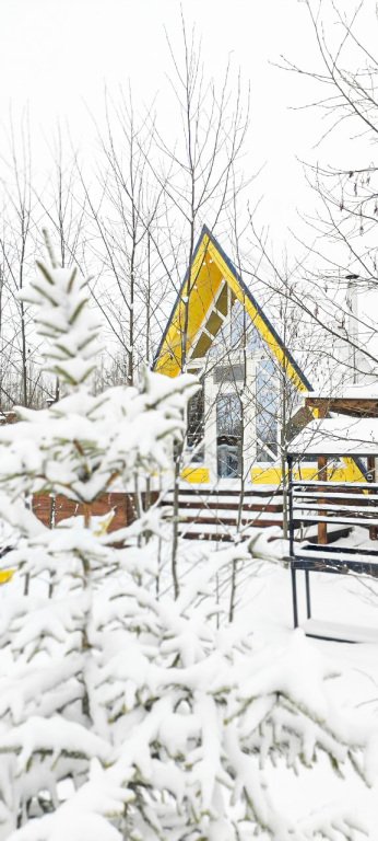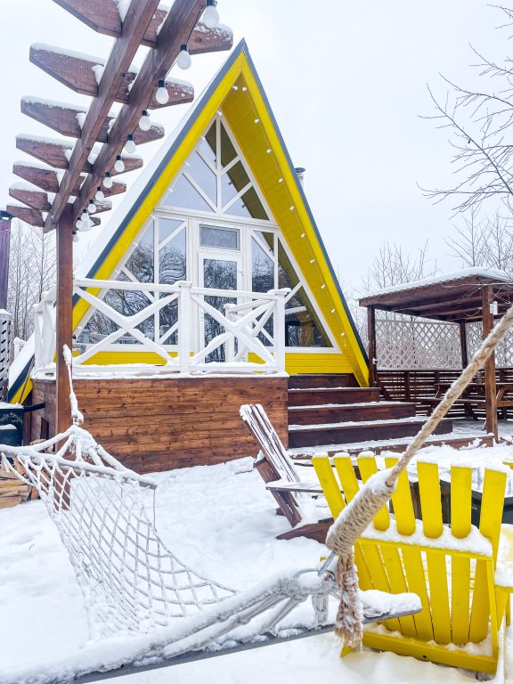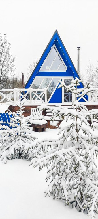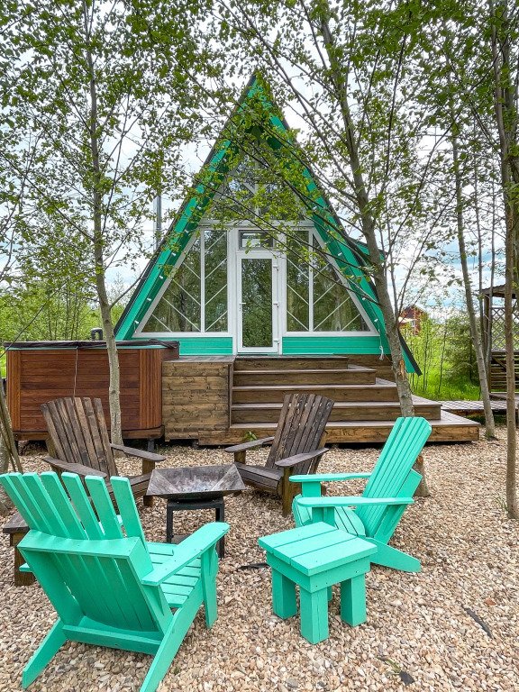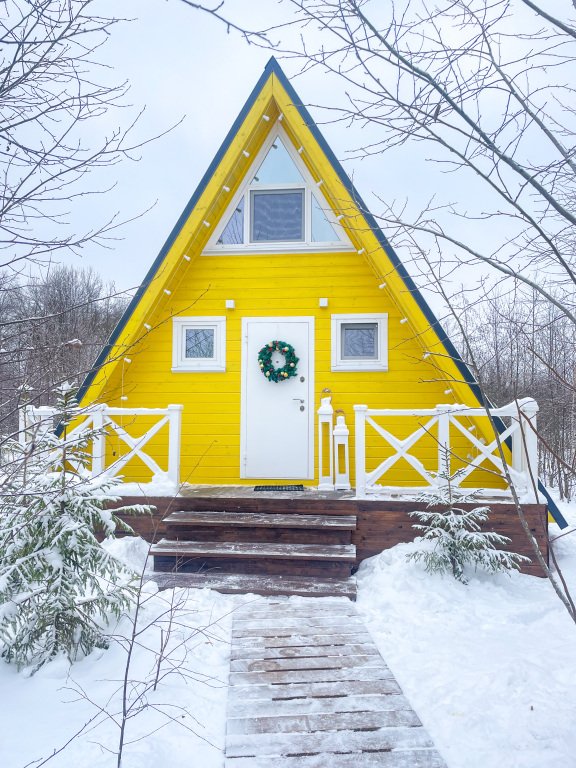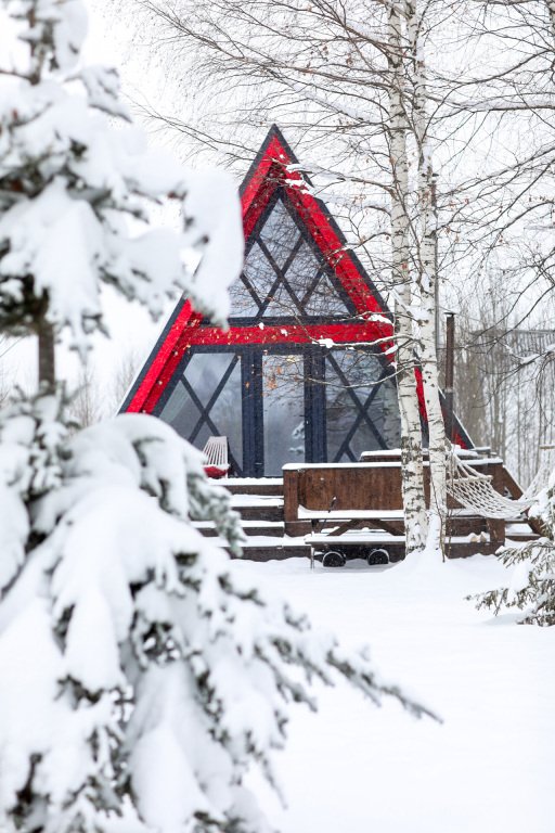 На территории в 1,5 гектара расположился уникальный комплекс для отдыха круглый год: 9 треугольных А-фрейм домов и 4 современных этнодомика в русском стиле, стоящие прямо у воды. Каждый дом отличается цветом и уникальным интерьером.