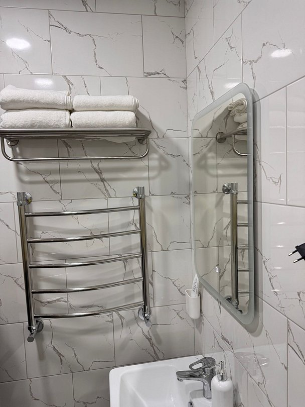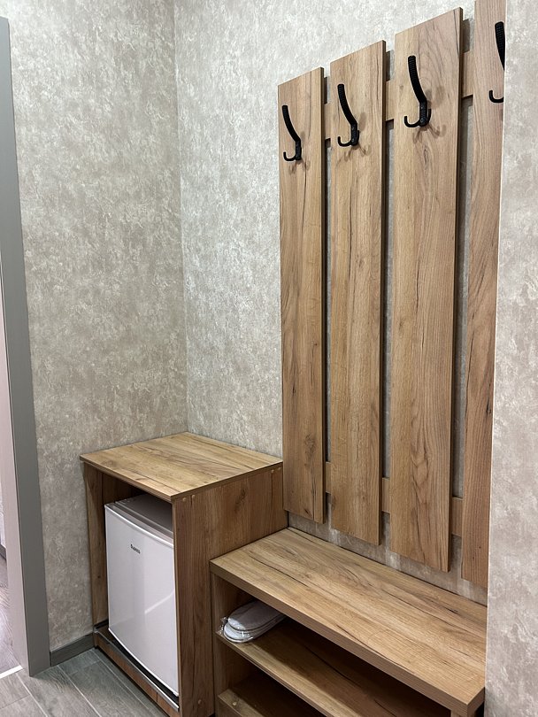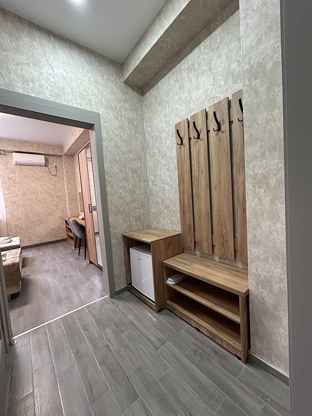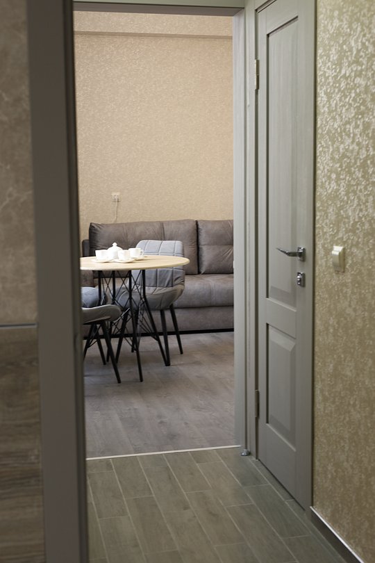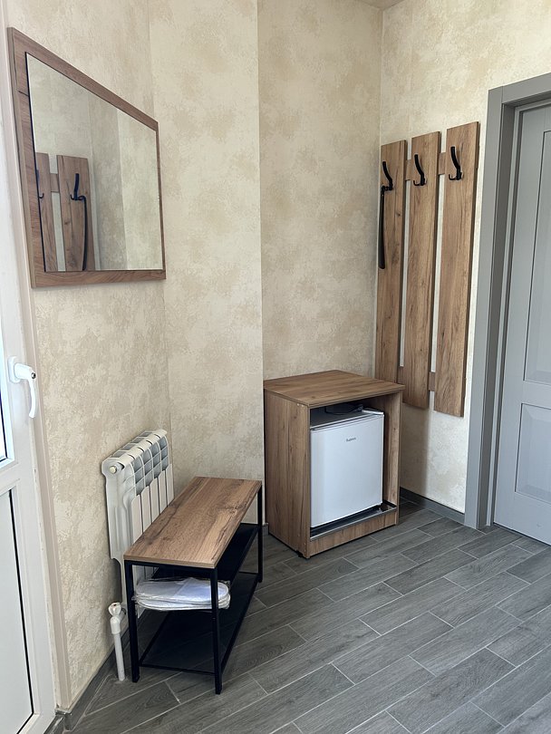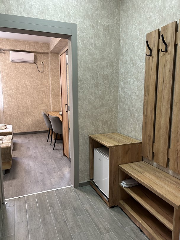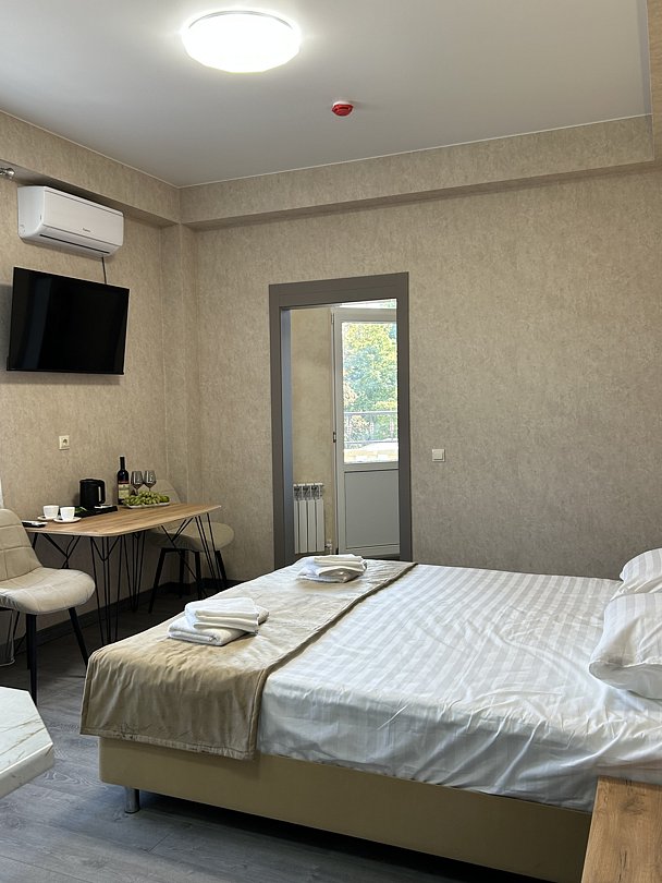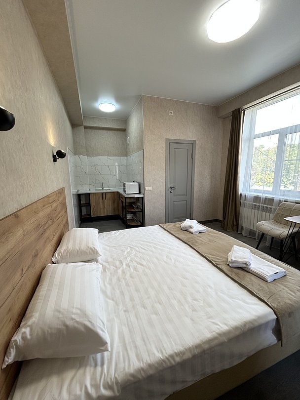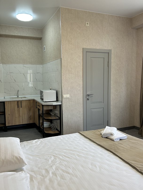 Уютная двуспальная кровать и комфортный диван-софа. Светлый просторный интерьер в теплых тонах. Современные удобства: ТВ, Wi-Fi, чайный набор, кондиционер, холодильник. Ванная комната с душем, средствами гигиены.