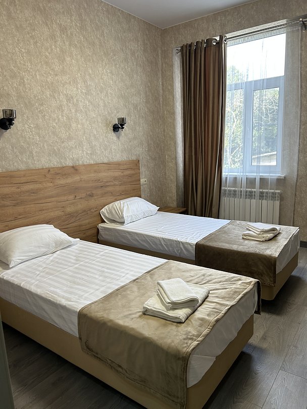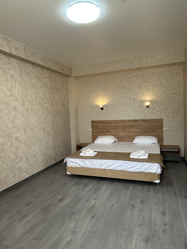 Уютная двуспальная кровать или две односпальные. Светлый просторный интерьер в теплых тонах. Современные удобства: ТВ, Wi-Fi, чайный набор, кондиционер, холодильник. Ванная комната с душем, средствами гигиены.
