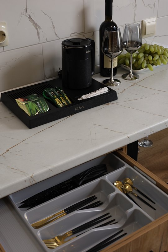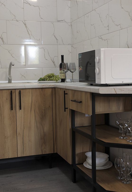 - холодильник, СВЧ-печь, чайный сет, столовые приборы и посуда;
