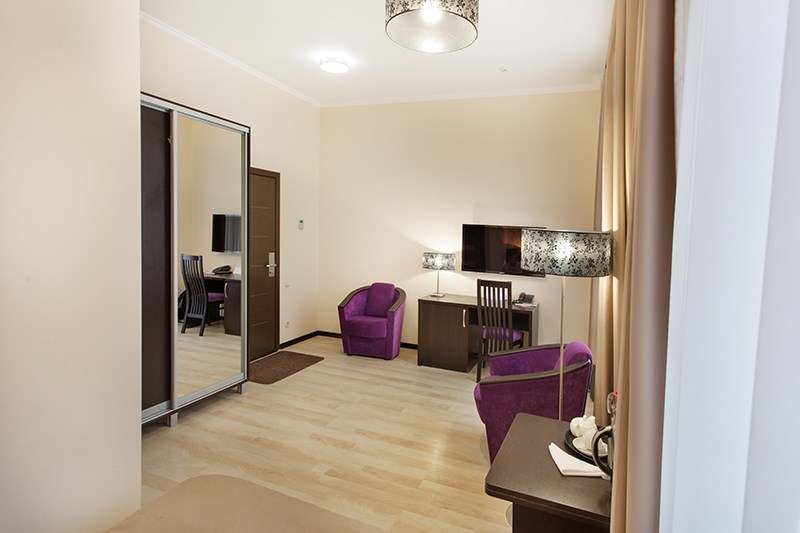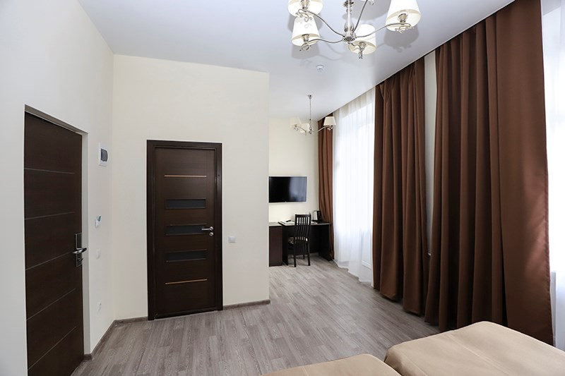 Оснащён всем необходимым оборудованием для комфортного пребывания. В номере кровати системы трансформер. Номера также позволяют размещать еще одно дополнительное место. Каждый номер уникален, поэтому площадь номера может отличаться.