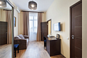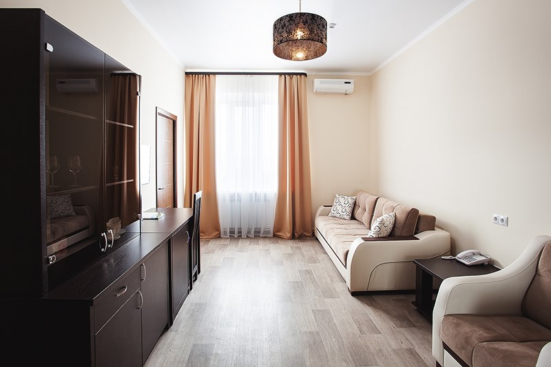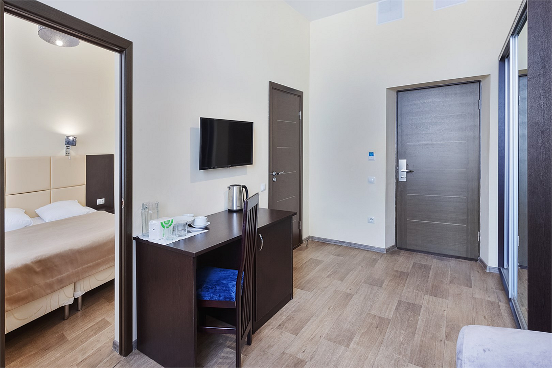 Двухкомнатный комфортный номер, состоящий из спальни и гостиной, с современным дизайном. Оснащён всем необходимым оборудованием для комфортного пребывания. В номере кровати системы трансформер.
