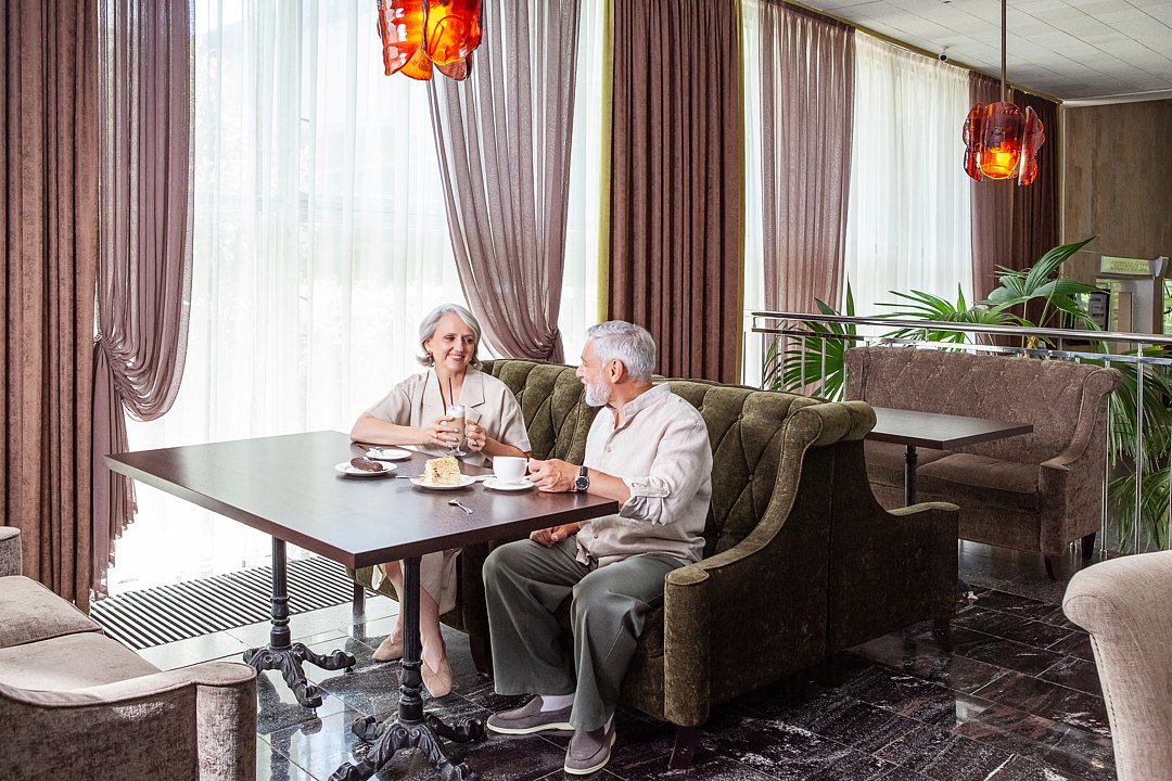 Лобби-бар санатория «Бештау» приглашает гостей провести время за чашечкой бодрящего кофе, попробовать чаи из горных трав Кавказа в приятной и изысканной обстановке. Большой выбор десертов никого не оставит равнодушным.