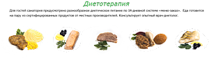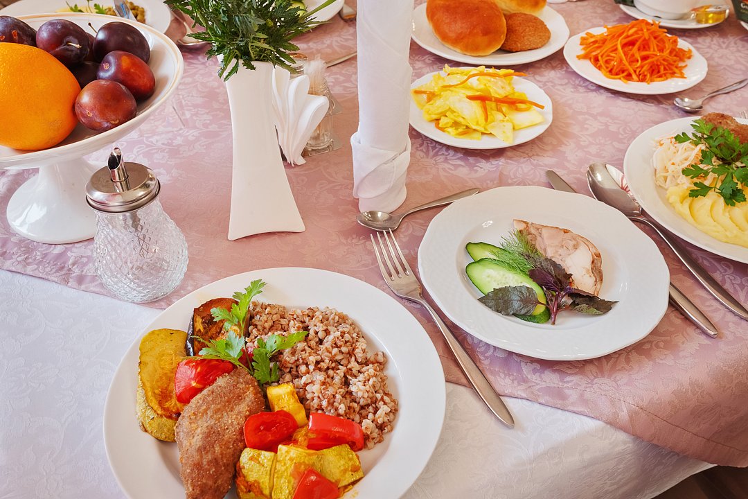Диетическое питание организовано по 5 основным диетам, возможно назначение диеты по старой классификации диет (№№1-15). При необходимости проводится консультация врача-диетолога. Основные блюда готовятся на пару, из экологически чистых продуктов.