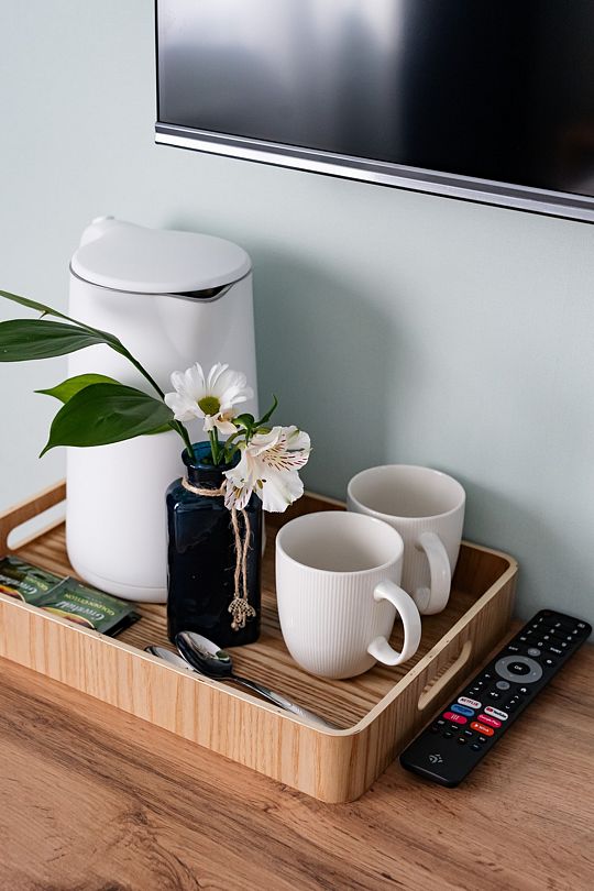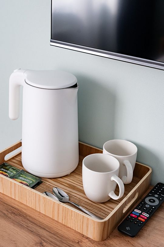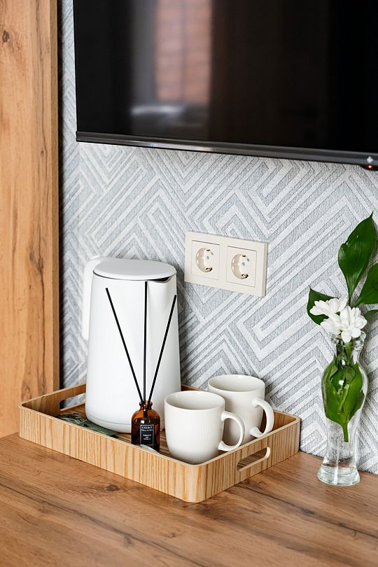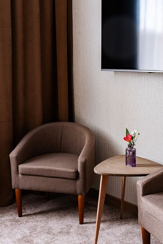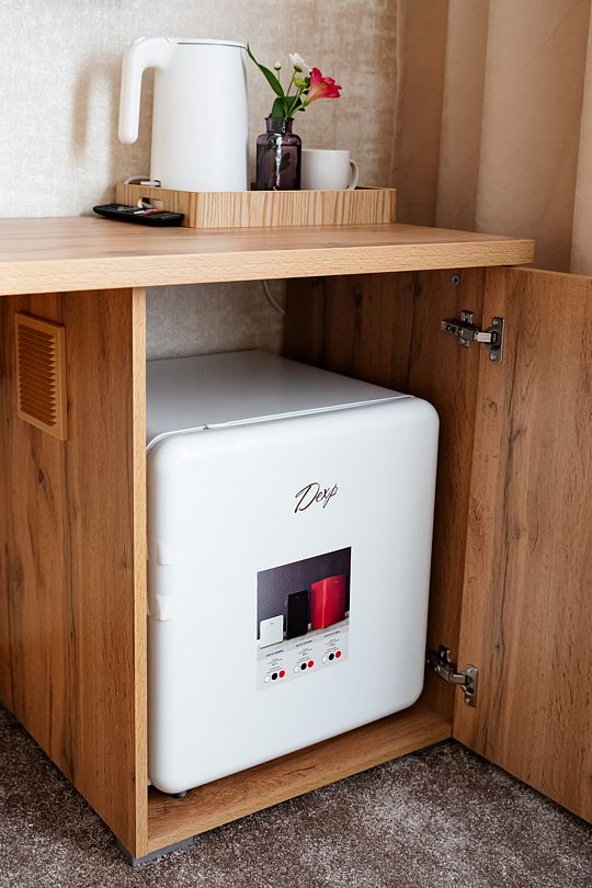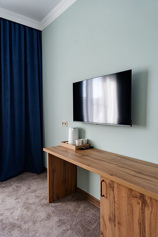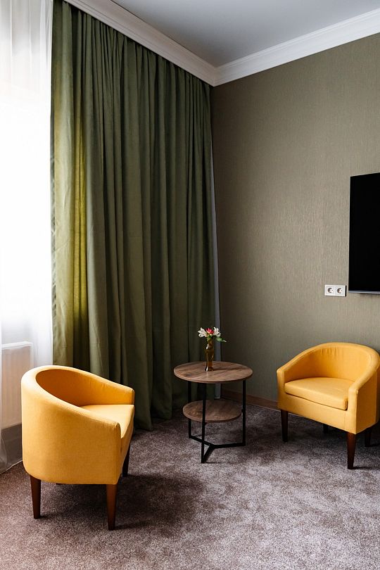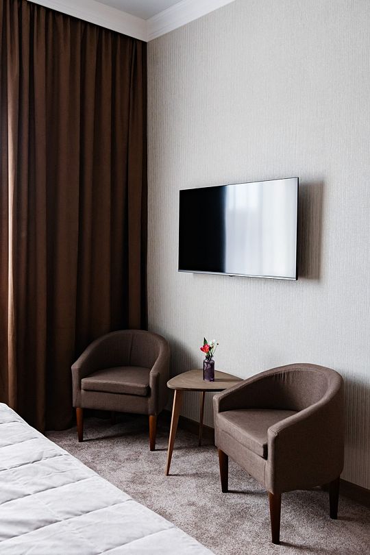 Вас ожидают номера, оснащенные всем необходимым для комфортного проживания: сейф, телевизор, кондиционер, шкафы для хранения одежды, обеденный и рабочий столы, стулья, посуда, электрочайник, холодильник, мини-бар и фен.