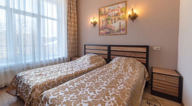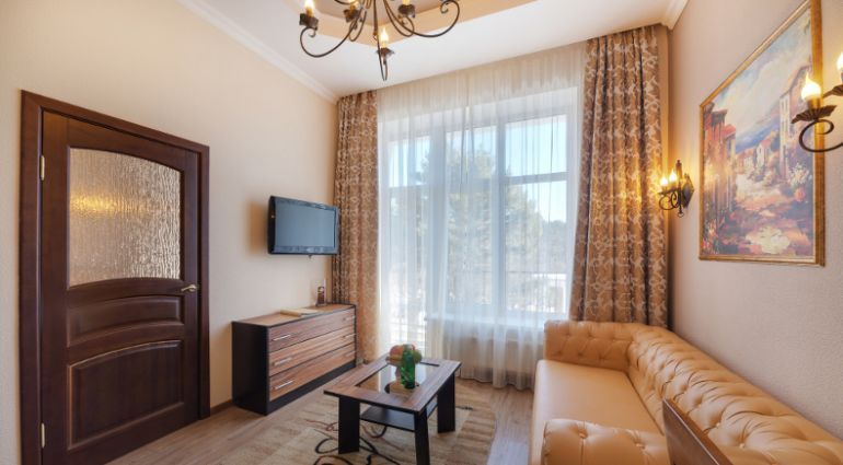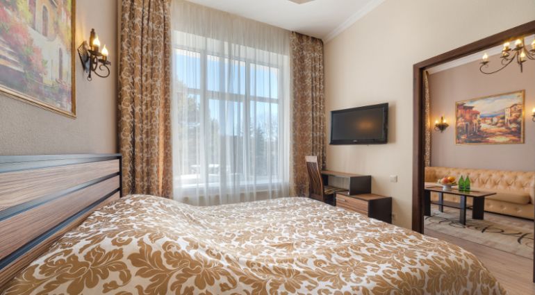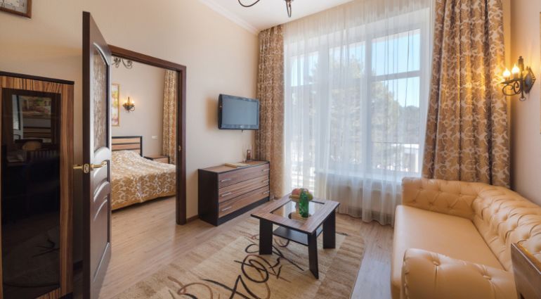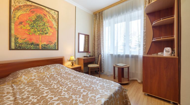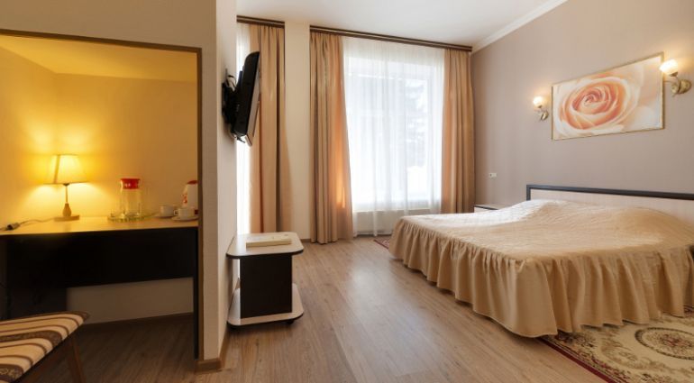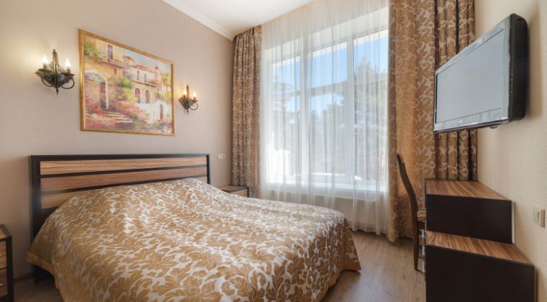 К услугам гостей 250 номеров различных категорий. Wi-Fi на всей территории санатория. Питание по системе «шведский стол». Услуги лобби-бара. Развитая инфраструктура – магазины, аптека, банкоматы, платежный терминал, библиотека, бильярд.