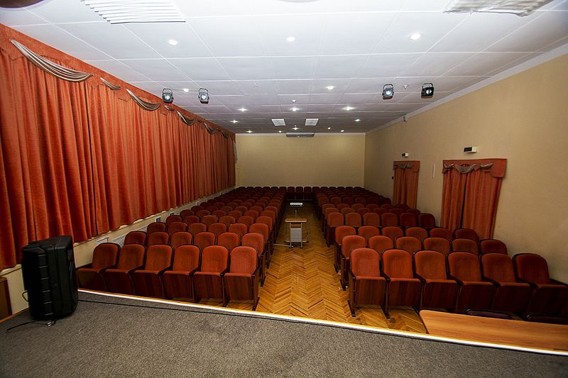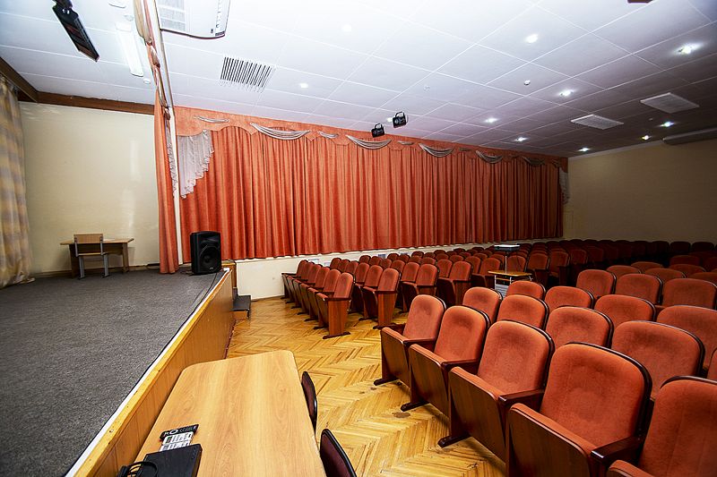 Актовый зал на 200 мест со сценой и кинопроектор для показа фильмов.
