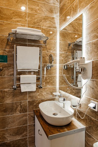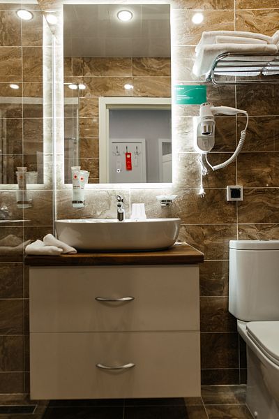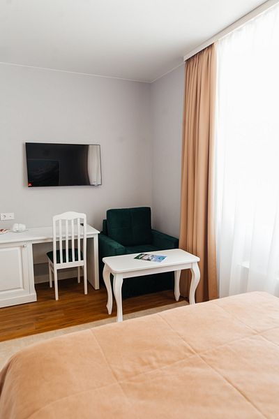 Номер состоит из спальни, обставленной стильной удобной мебелью, и с ванной комнаты c душевым ограждением и туалета. Номер находится в 7 корпусе. На фото представлены примеры будущего интерьера номеров.