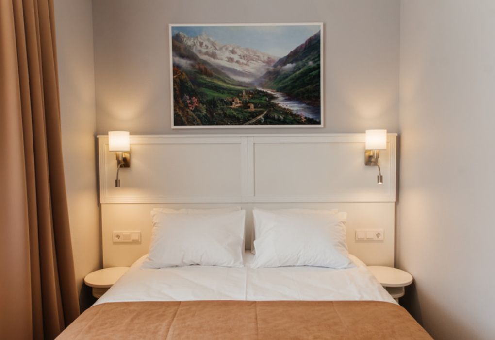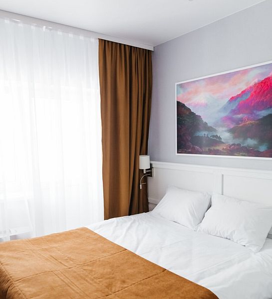 Элегантный двухкомнатный номер с двуспальной кроватью и диваном для предназначен комфортного размещения 2-3 гостей.