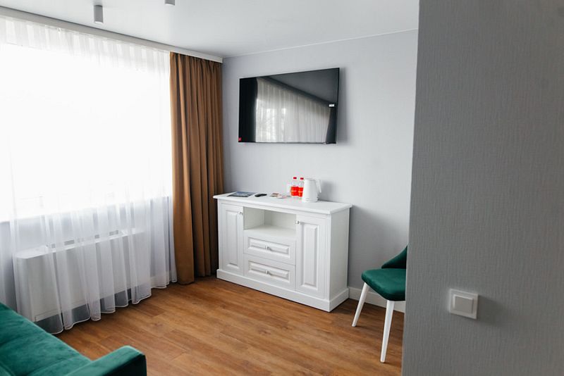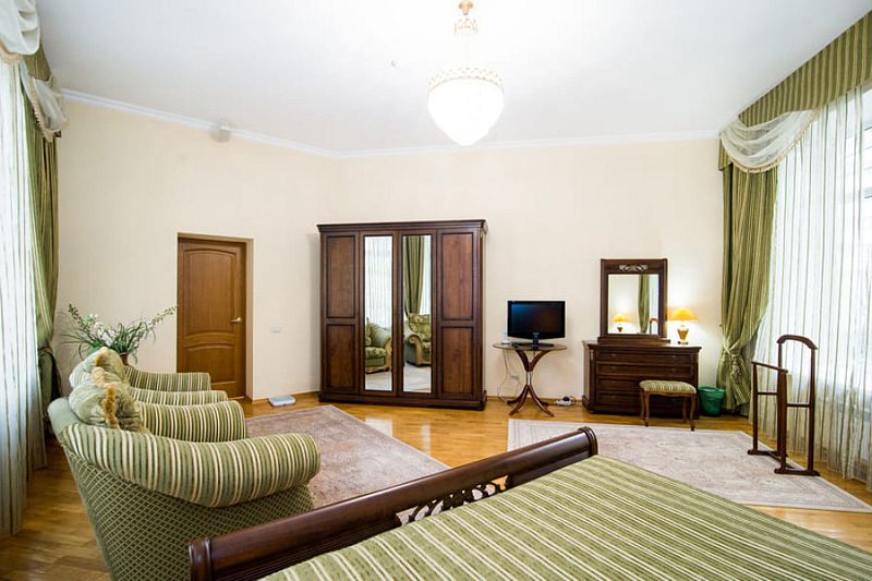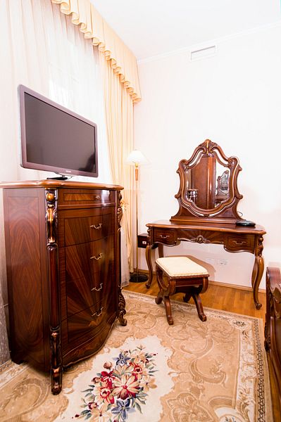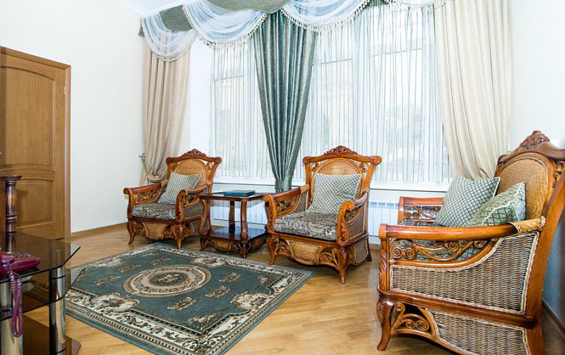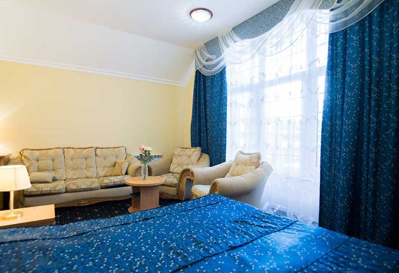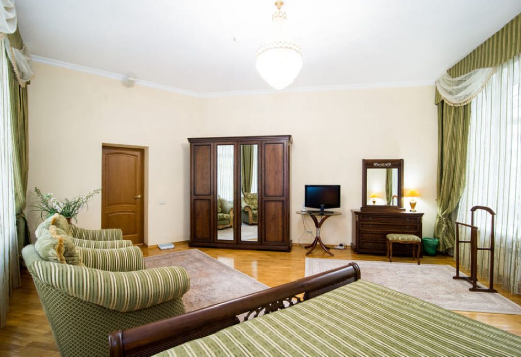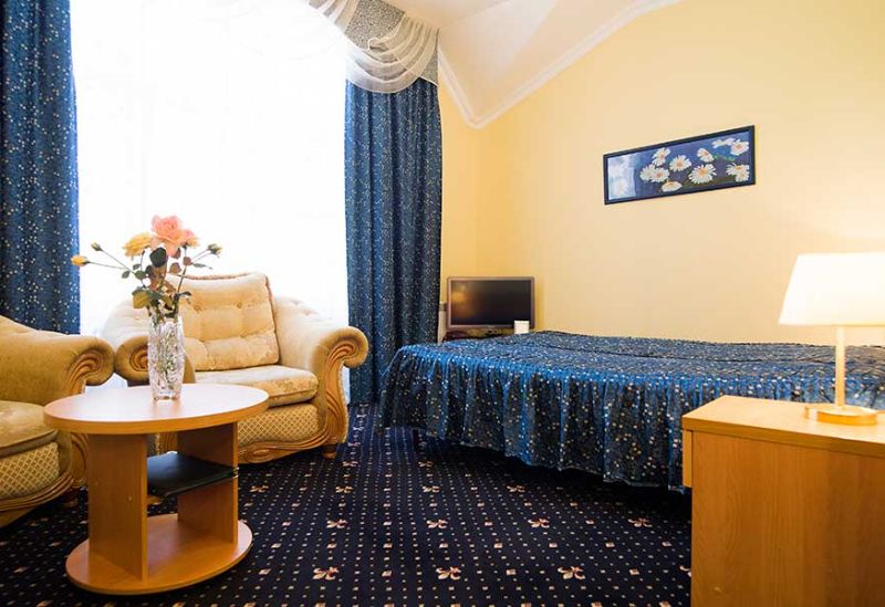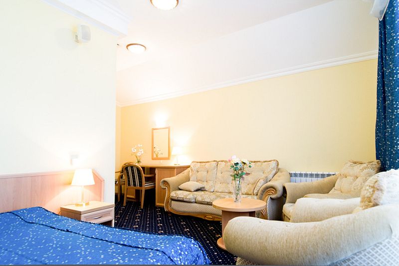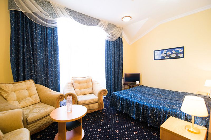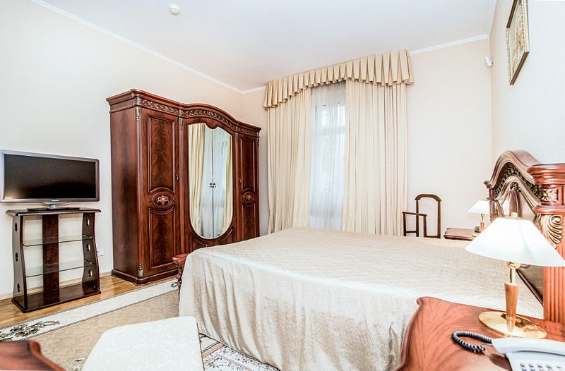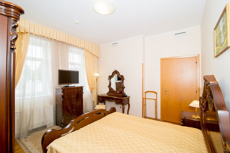 Номер состоит из спальни, гостиной и собственной ванной комнаты, оснащён удобной красивой мебелью и всем необходимом для приятного отдыха.