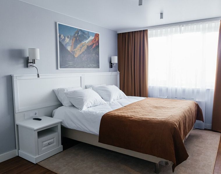 Просторный улучшенный номер с двуспальной кроватью и диваном оформлен в приятных светлых тонах.