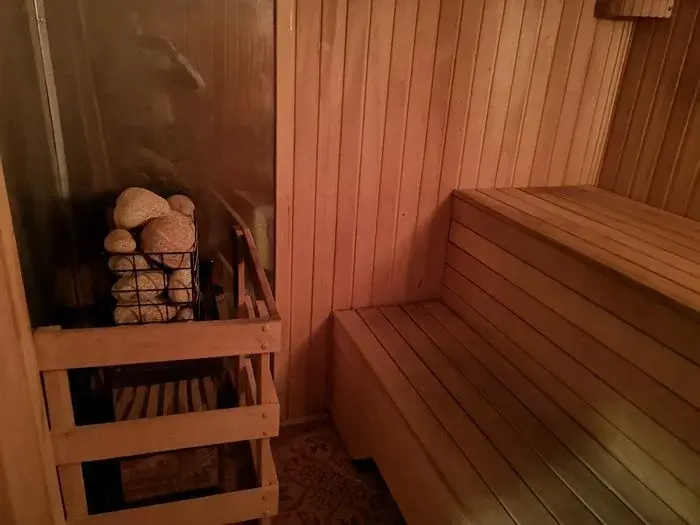 За бассейном расположена финская сауна с зоной отдыха. За 15 минут насыщенный древесными фитонцидами и эфирными маслами пар прогревает организм, способствуя улучшению обменных процессов, выведению токсинов, шлаков