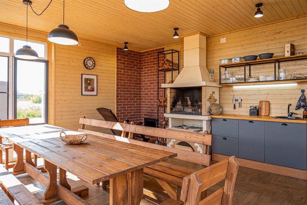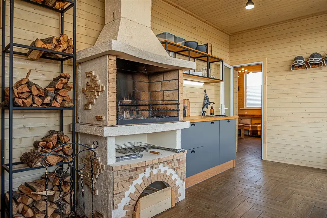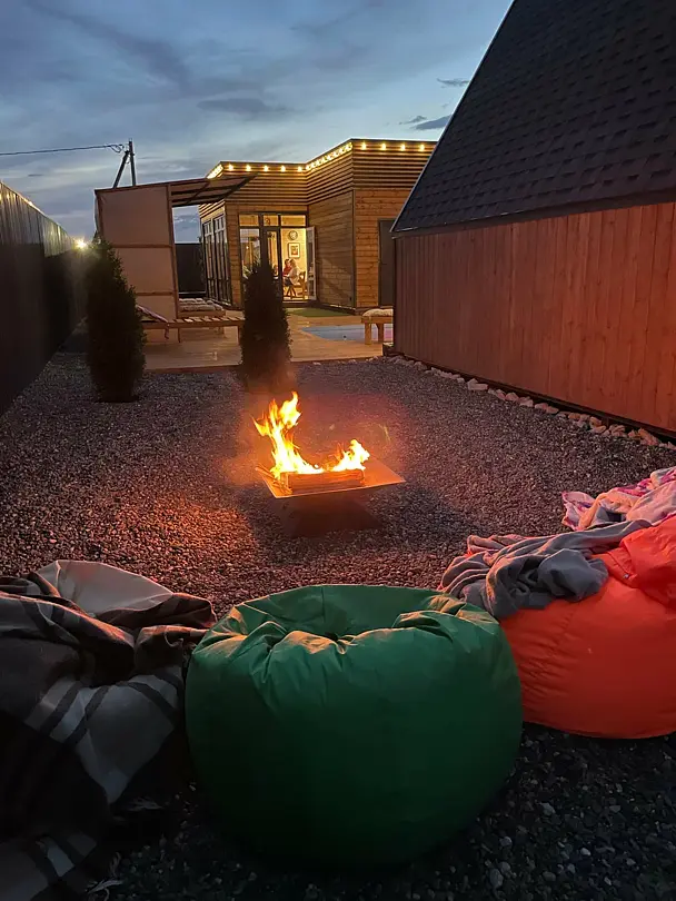На территории оборудован открытый бассейн, просторная гриль-беседка для компании до 17 человек, баня на дровах и зона отдыха с костровой чашей, возле огня которой можно провести атмосферный вечер вместе с друзьями и близкими.