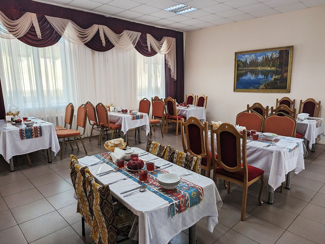 Свою признательность и восторг выражаем и работникам столовой. Кормили очень вкусно и в достаточном объеме! Питание по меню-заказу с выбором из двух блюд, что даже лучше, чем шведский стол, т.к. всегда всё свежее. У нас была диета № 15. Каждый прием пищи начинался с дежурного салатика. Завтрак: салат; молочная или на воде каша; горячее с гарниром; чай/кофе/молоко; сливочное масло, сыр/колбаса; конфета/печенье. Обед: салат, суп, горячее с гарниром, компот; фрукты. Ужин: салат; горячее с гарниром; чай; запечённая тыква с фруктами/творожная запеканка/сладкий творог; кефир/сок; булочка/слойка. За две недели блюда почти не повторялись, мы даже все перепробовать не успели.