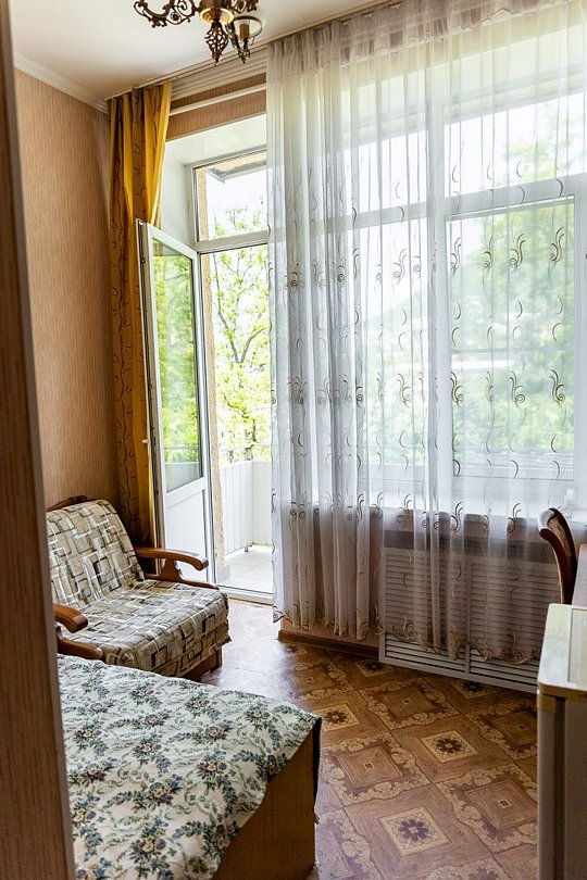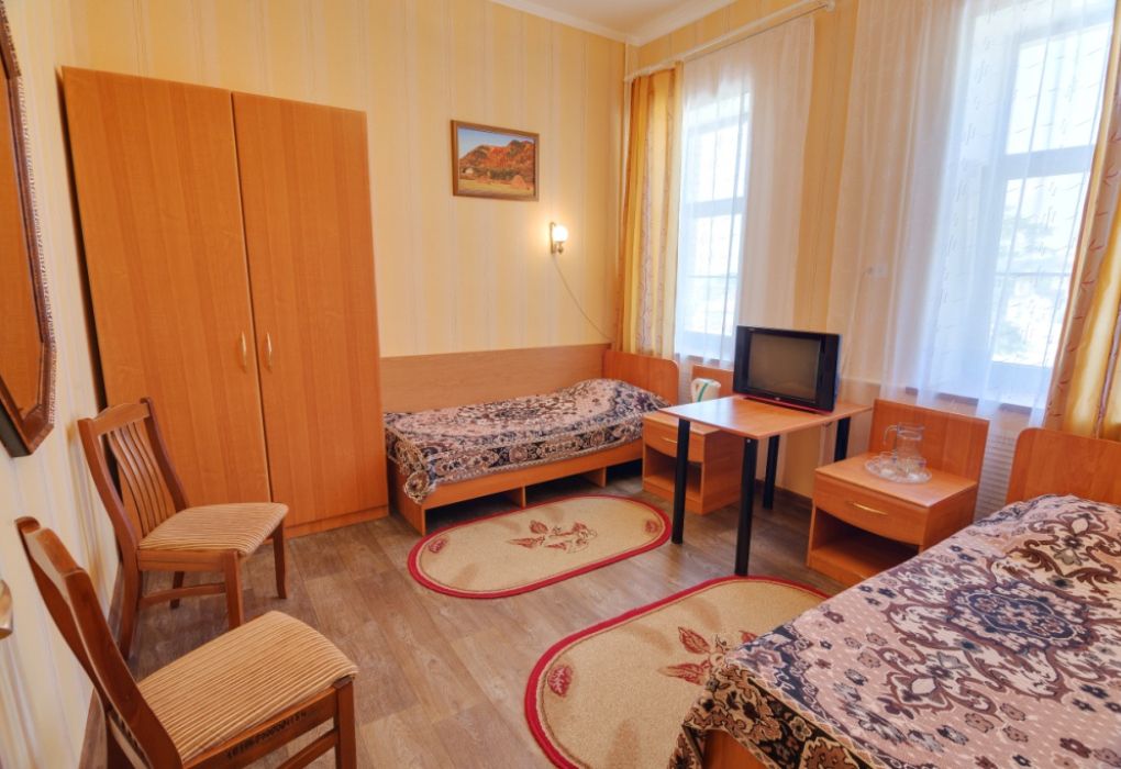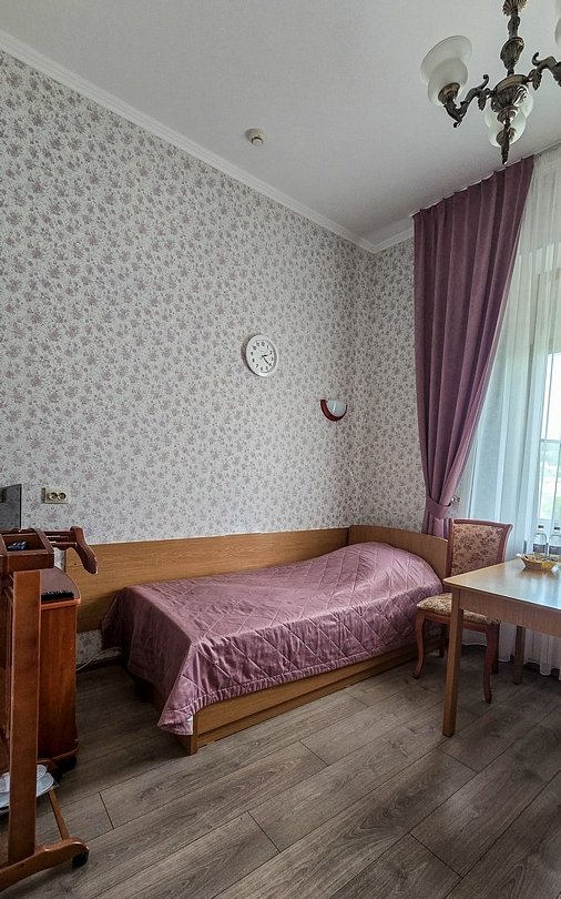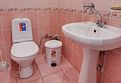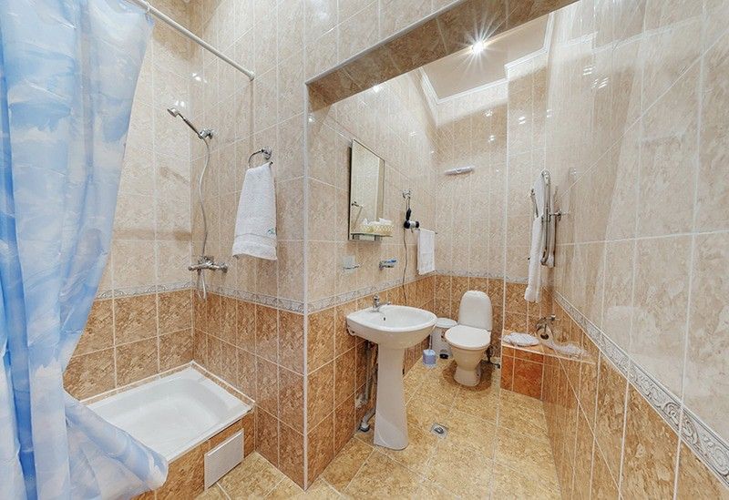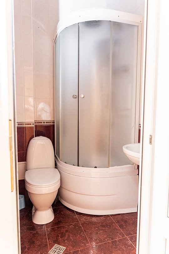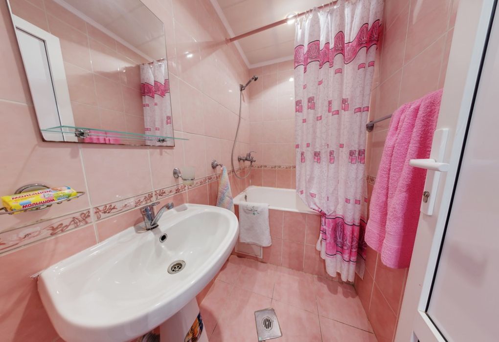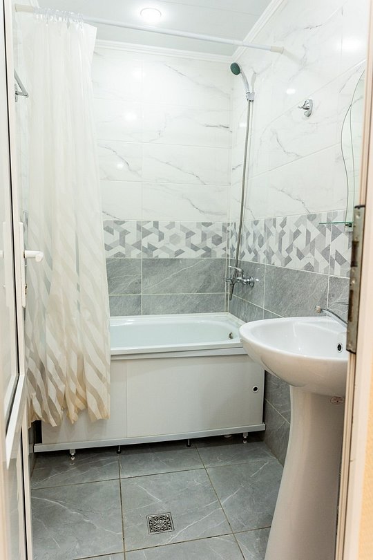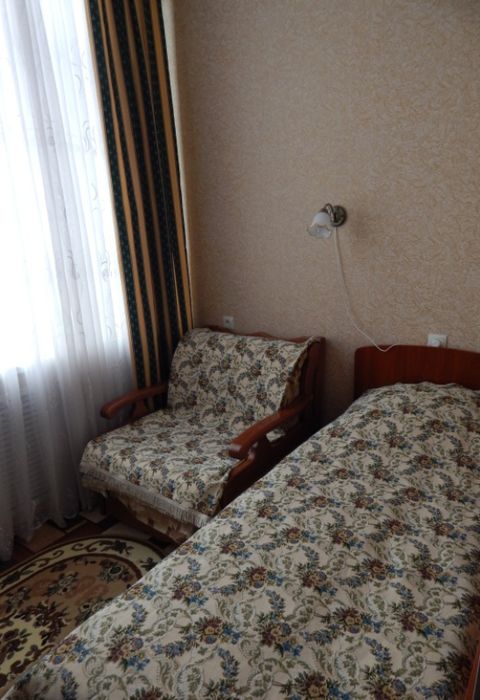 Шторы и покрывала в стиле 90-х годов и не знавшие чистки с тех же пор. Для входа в ванную комнату нужно подняться по трём ступенькам. На полочке у зеркала лежал комплект умывальных принадлежностей. Три комплекта полотенец для каждого жильца. В период проживания умывальные принадлежности не пополнялись. Постельное бельё менялось 1 раз в неделю. По мере необходимости полотенце меняли по просьбе, без проблем.