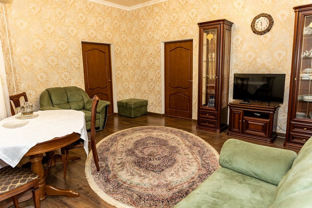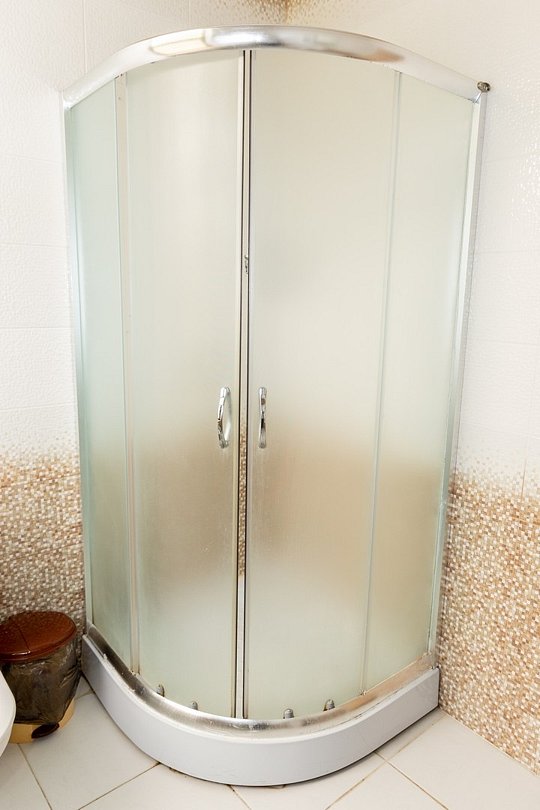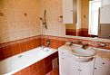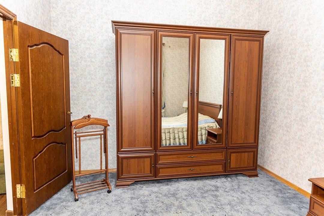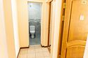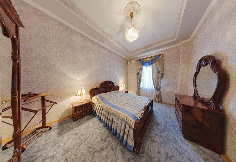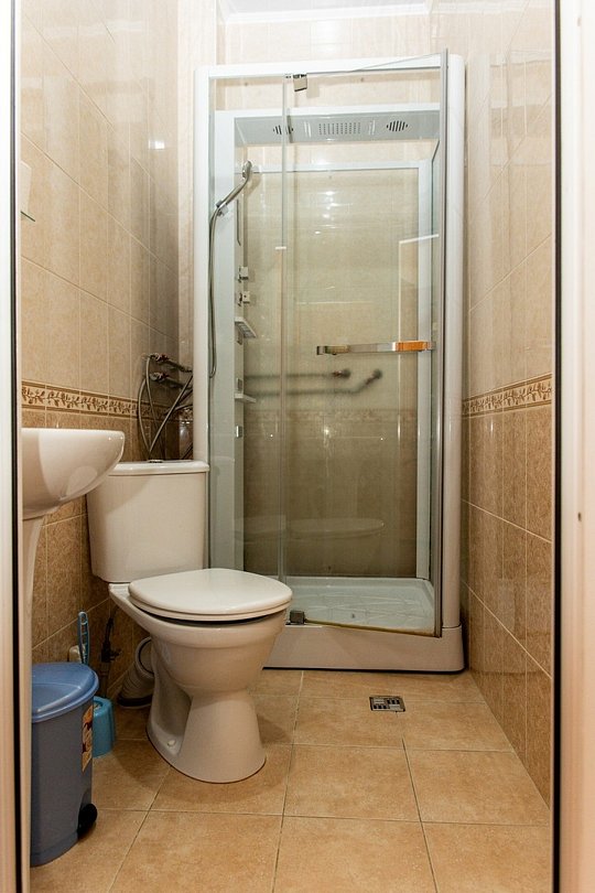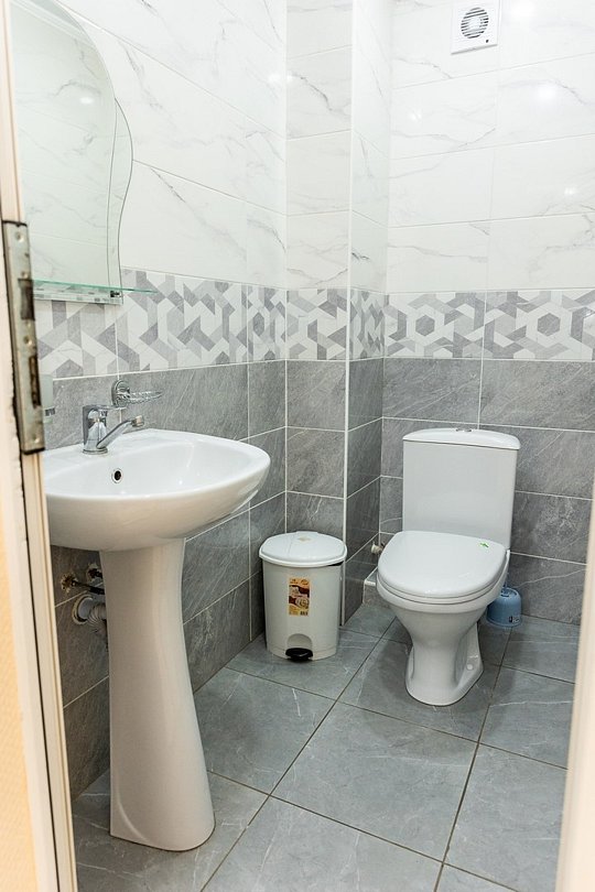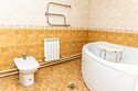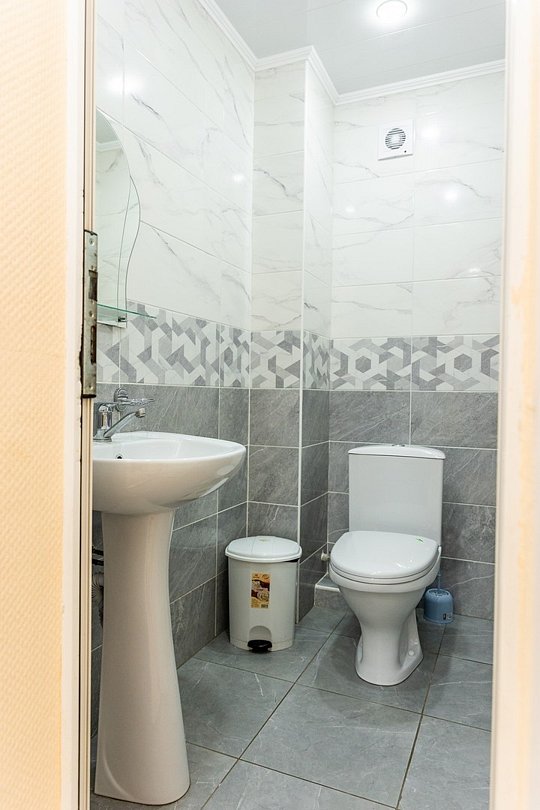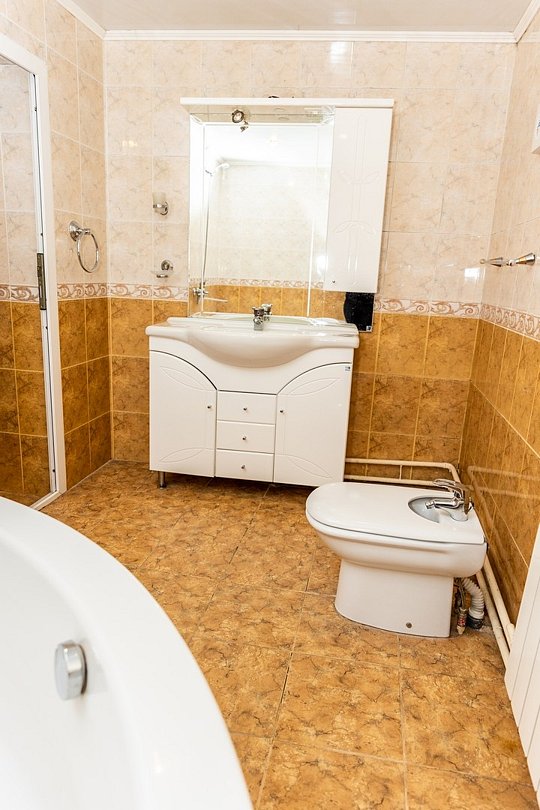 Шторы и покрывала в стиле 90-х годов и не знавшие чистки с тех же пор. Для входа в ванную комнату нужно подняться по трём ступенькам. На полочке у зеркала лежал комплект умывальных принадлежностей. Три комплекта полотенец для каждого жильца. В период проживания умывальные принадлежности не пополнялись. Постельное бельё менялось 1 раз в неделю. По мере необходимости полотенце меняли по просьбе, без проблем.