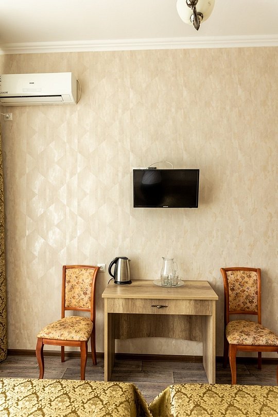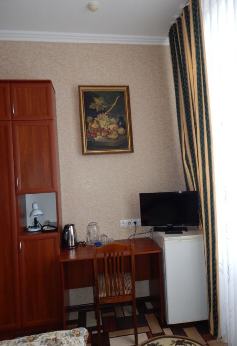 В номере хороший ремонт, оборудован кондиционером, холодильником, чайником, комплектом посуды, ж/к телевизором, феном, телефонный аппарат внутренней связи в номере (душевая кабина, санузел совмещен).