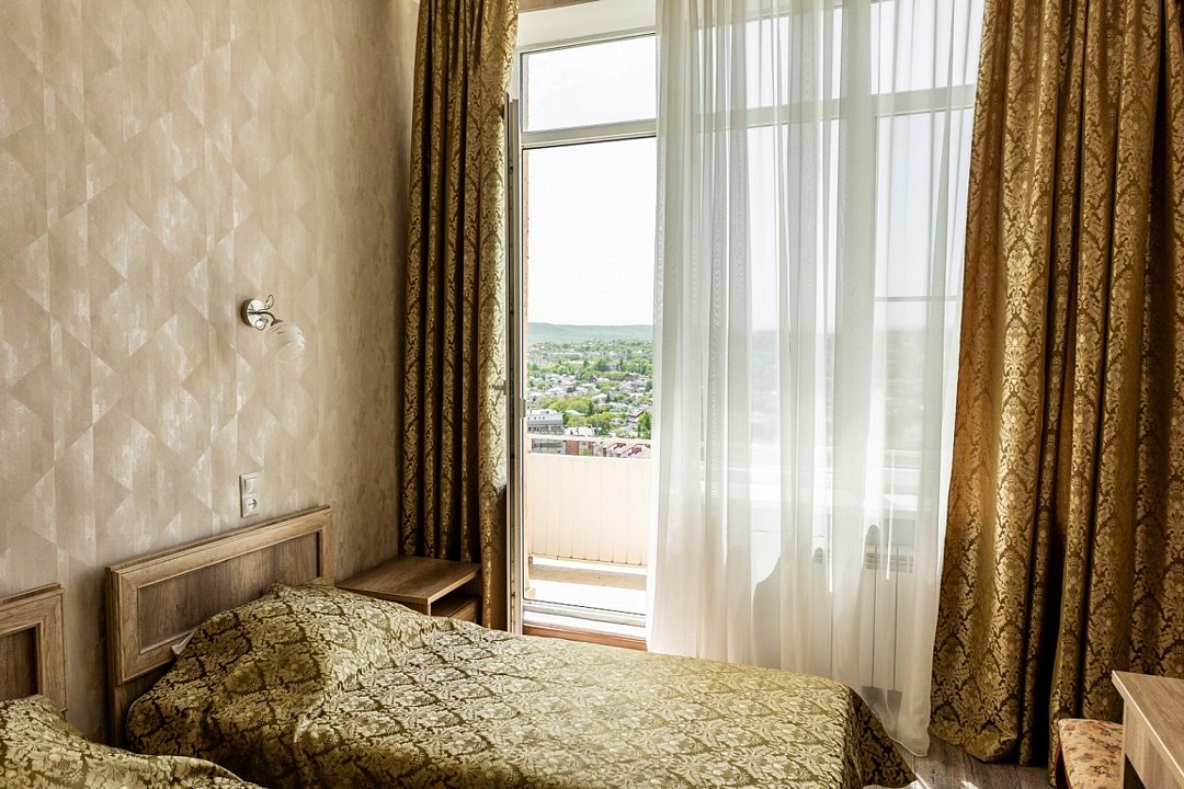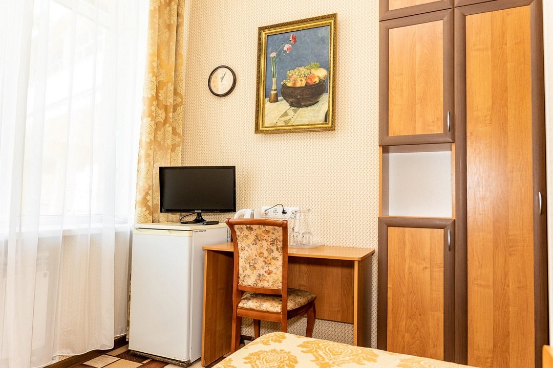 Одноместный стандартный номер с балконом, площадью 10 кв. м, состоит из одной жилой комнаты, с санузлом (душевая кабина, санузел совмещен), укомплектован 1,5 кроватью, + доп. место кресло-кровать, холодильником, телевизором, электрочайником, феном, телефонный аппарат внутренней связи в номере.