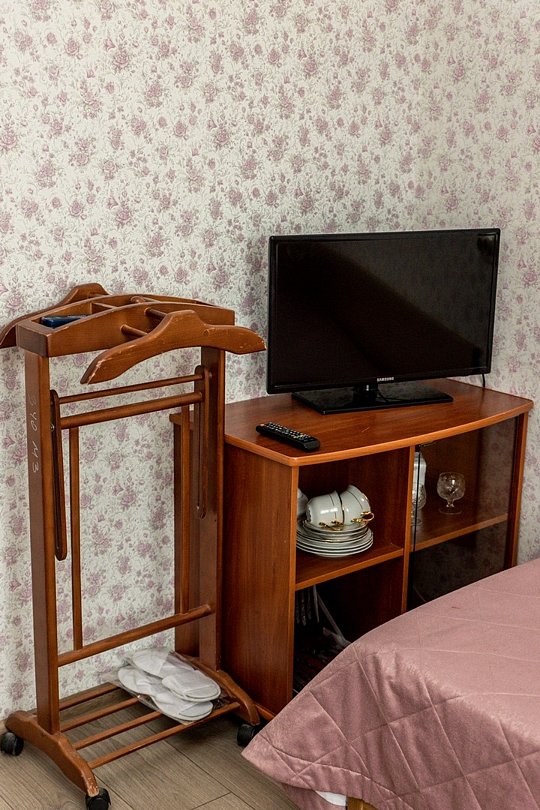 Номер. Номер наш расположен в старой части санатория, бывшем доме зодчего Самуила Ивановича Уптона, главного архитектора Кавказских Минеральных Вод, построенном в 1851 году. Т.е.жили мы почти в замке , построенном в 1851 году. Конечно, внутри он подвергся реконструкции в результате которой получилось три номера 101, 102 и 103. Узкий холл нас встретил ковровой дорожкой, кулером с водой, гладильной доской с утюгом и хозяйским шкафом. Согласитесь, что вода и гладильная доска на 3 номера – это хороший плюс. Не надо бегать по коридорам в поисках места, где можно привести свою одежду в порядок. Услуги по стирке и химчистке в санатории отсутствуют, и это объяснимо, ведь это не 5 * отель. Номер стандартный: две кровати, две тумбочки, шкаф двухстворчатый, плечики для одежды имелись в достаточном количестве, письменный стол на котором присутствовал телевизор с приставкой и электрический чайник, журнальный стол-тумба с блюдцами, чашками и столовыми приборами.