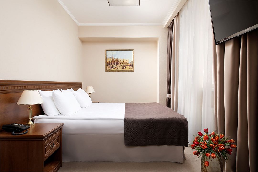 Однокомнатные просторные номера, площадью 31 кв.м. расположены преимущественно на высоких этажах гостиницы (с 8 по 15 этаж). Обставлен в классическом стиле. В номере установлена качественная красивая мебель с прикроватными тумбочками, на каждой из которых располагается индивидуальное освещение. Размер кровати 1,80 см. *1,90 см. Ортопедический матрас. Для одежды и других вещей постояльцев предназначаются вместительные шкафы и тумбочки. Номера с Евро ремонтом. Предоставляется "Комплимент" от администрации гостиницы: чай/кофе/сахар/питьевая водаУслуги и удобства