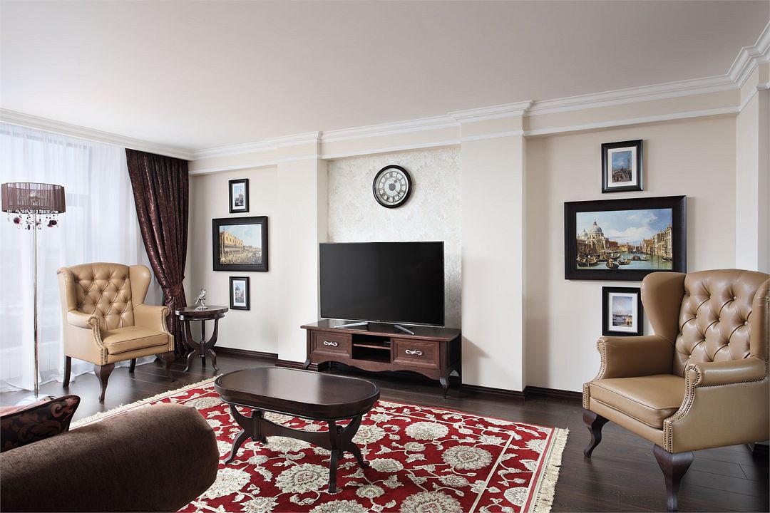 кабельное телевидение, Wi-Fi, телефон, холодильник, кондиционер, светильник, настольные лампы, фен, электронные замки, кофемашина, ванная с джакузи, санузел, дополнительный санузел, дополнительная ванная комната, теплый пол, банные принадлежности, халаты, банные полотенца, тапочки, гигиенические средства, косметические средства, сауна, кровать «King size», диван, кресла, тумбы, стулья, шкаф для одежды, вешалки, журнальный столик, письменный стол, обеденный стол, зеркало, пуфики, ковер, эксклюзивная мебель, мебельный гарнитур, две комнаты, звуконепроницаемые стены и окна, чайный набор, набор посуды, обслуживание номеров, информационная карта, меню, сейф, минеральная вода, чайник, унитаз, раковина, косметическое зеркало, питьевая вода, гостиная зона, отопление, душ, вид на город, стаканы, столовые приборы, туалетный столик, три телевизора, парна́я, уборка номера, услуги прачечной (платно), бутылка вина, шапочка для душаВ гостиничном номере