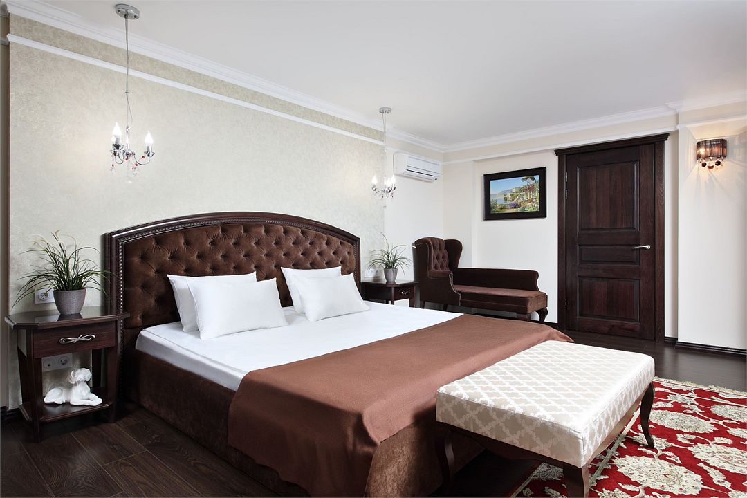 Комфортные светлые номера с Евро ремонтом 2015 г. Удобная мебель. Двуспальная кровать, размером 180 см. x 200 см. В каждом номере к услугам гостей предоставляется бесплатный набор для приготовления чая и кофе, телевизор, 50 кабельных каналов. Помимо бесплатного доступа в интернет, WI FI в номерах есть телефон и индивидуально регулируемый кондиционер. В ванных комнатах, душ, фен, тапочки, гигиенические принадлежности.Услуги и удобства