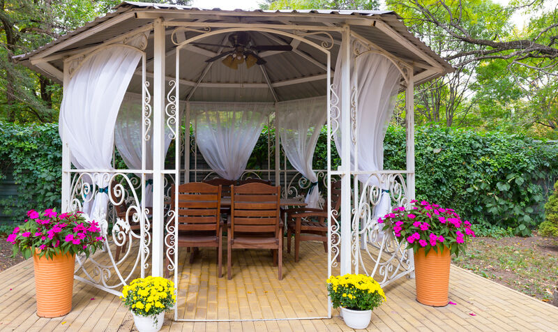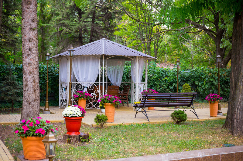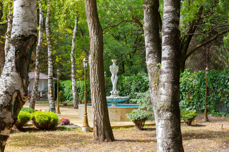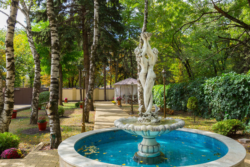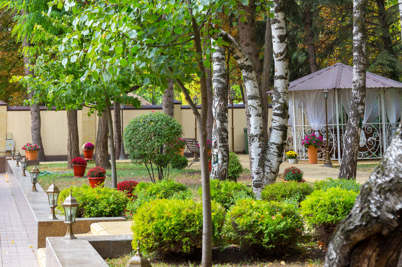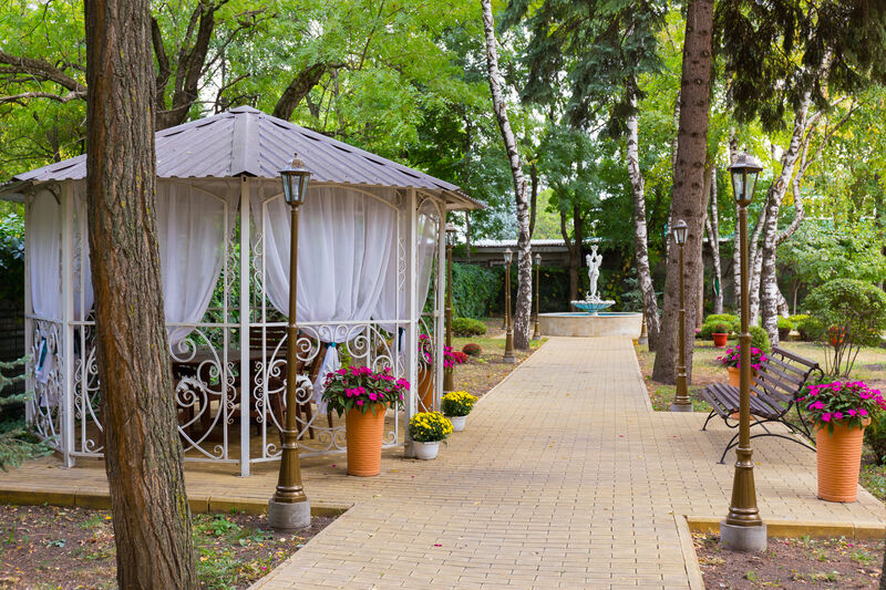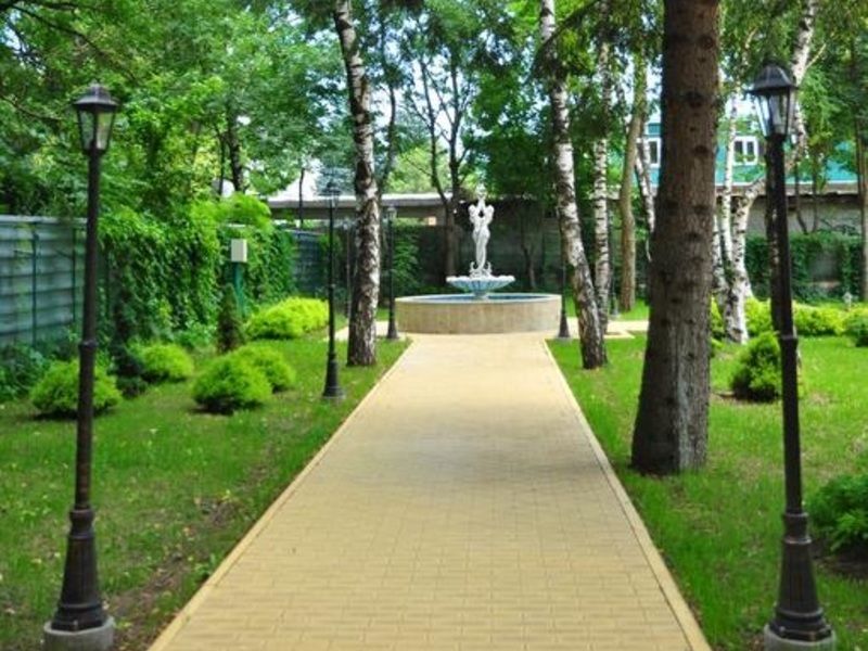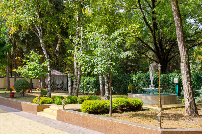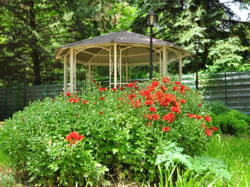 Территория корпуса украшена клумбами из цветов, красивым фонтаном, беседками.
