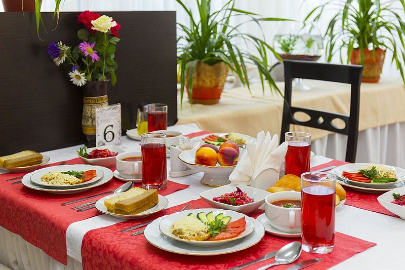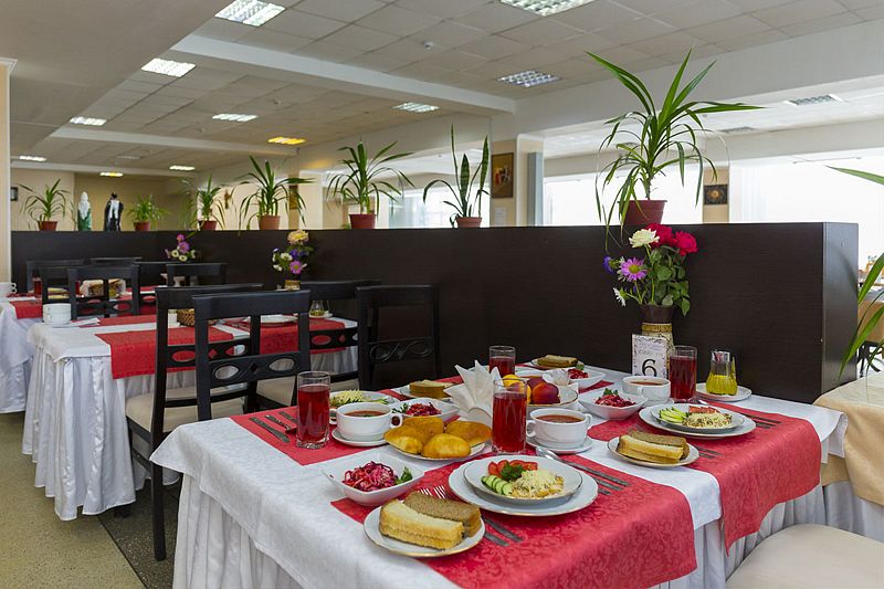 Трапезы проводятся в просторных и светлых обеденных залах ресторанного типа. Отдыхающих ожидают красиво сервированные столы и вкусные, привлекательно оформленные блюда, приготовленные по запросу.