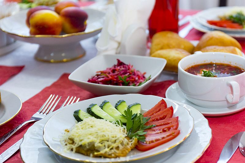 На завтрак подаются мясные, творожные и овощные блюда, закуски, молочные каши. В обед предлагаются закуски и различные виды первых блюд. Вторые блюда включают мясо, курицу и рыбу – на выбор. В ассортименте напитки и свежие фрукты. На ужин подаются овощные и творожные запеканки, закуски и сыро-колбасные изделия.