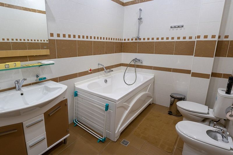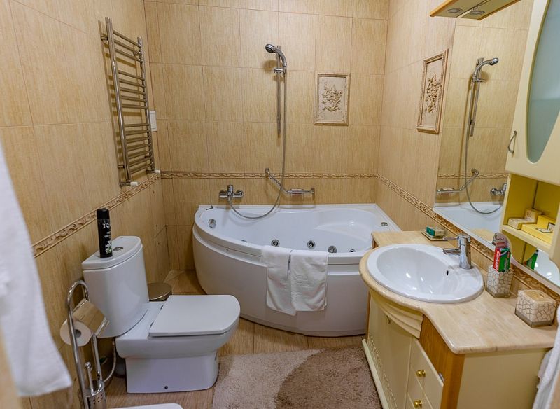 Номер отличается большим размером жилой и ванной комнаты, прихожая оснащена большим шкафом-купе с зеркальными дверьми