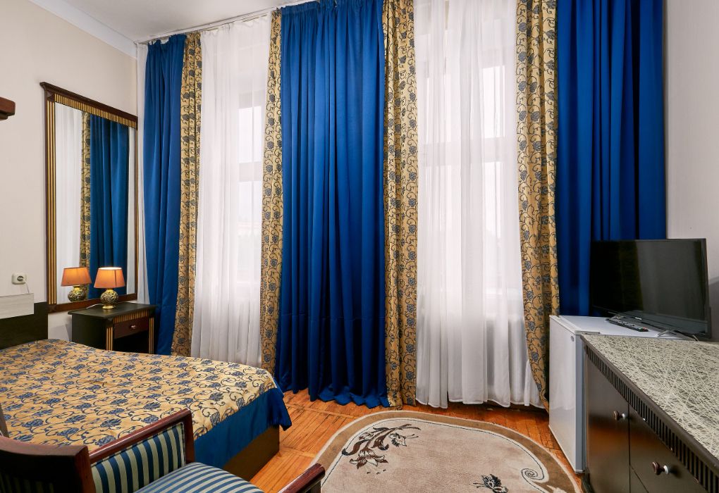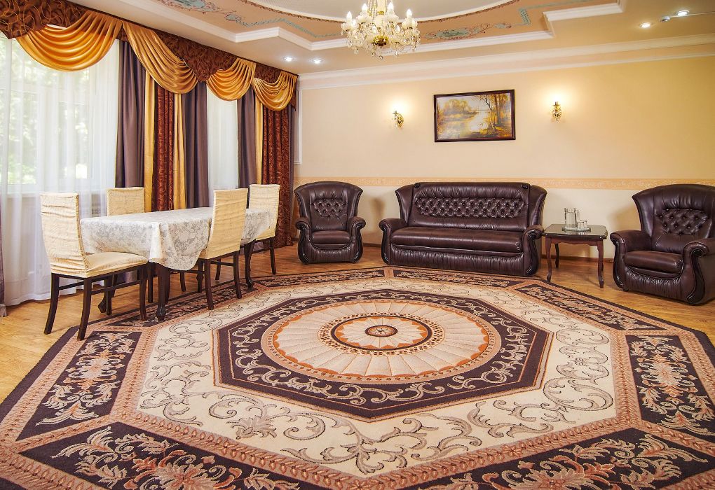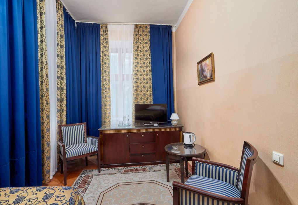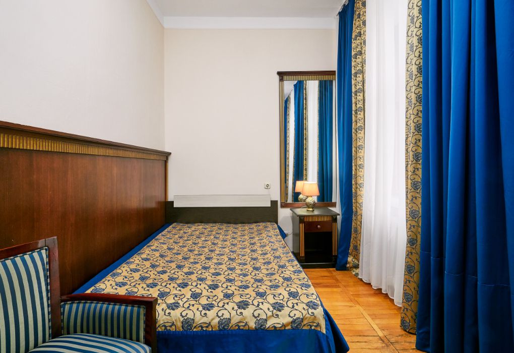 телевизор с множеством каналов, хорошее освещение, сантехника вся блестит. Очень понравилась идея с полотенцами. Два набора разного цвета, чтоб не путать. Не было полотенца для ног. Из ванных принадлежностей только кусочек мыла. Окна новые, с сетками, на балконе сушилка. Т.к окна выходили на главную улицу, спать мешали; то молодежь, то собаки их целая стая рядом живет, а под утро птицы щебечут очень громко. Мы спали с открытыми окнами. Фена и чайника нет. Есть кувшин и стаканы. Вода в кулере на этаже. Я заваривала кофе в термокружку и брала на завтрак. В коридорах ремонта пока нет, но все достаточно чисто, ухоженно. Сталинский ампир создает особое настроение! Особенно хороши ; обеденный зал и зал для выступлений. По вечерам в этом зале проводились поочередно танцы и концерты.