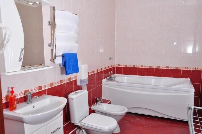 Номер 51,двух-комнатный люкс. Такой, как на фотографиях на сайте. В номере есть кондиционер, холодильник, посуда, чайник, чай, кофе. В ванной комнате все необходимые принадлежности: фен, шампунь, бритвенные принадлежности, зубная щетка, паста. Также есть халаты и тапочки.