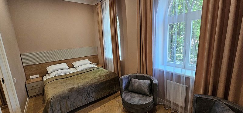 Однокомнатный, комфортабельный, просторный номер с двуспальной кроватью и всеми удобствами, площадью до 30 кв.м. Есть раскладывающийся диван или кресла.
