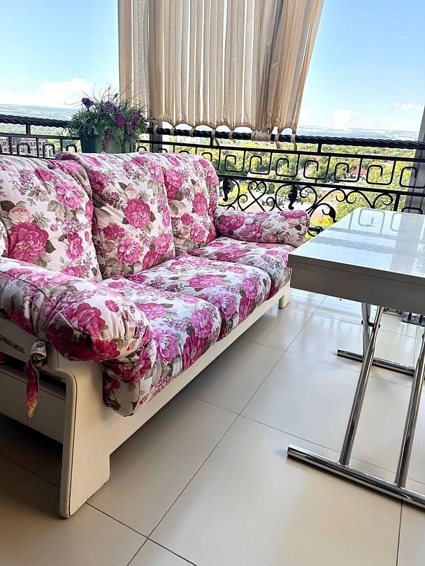 Просторный однокомнатный номер с большим диваном-кроватью. Обеденный стол.