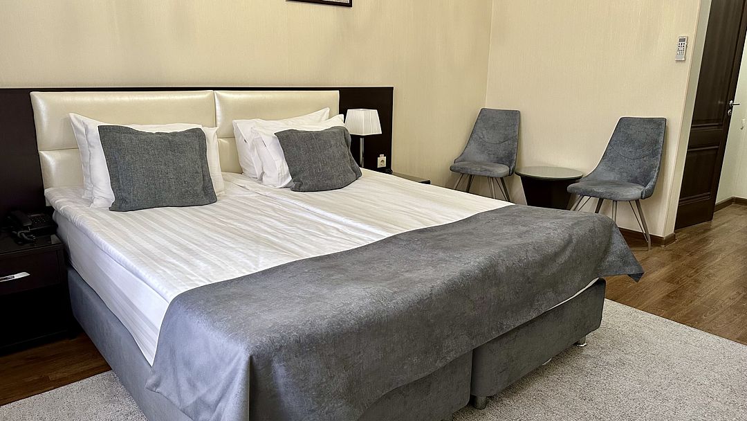 New Комфорт — просторный обновлённый номер с современным интерьером, созданный для тех, кто ценит уют и дополнительное пространство. В номере — большая двуспальная кровать, удобная зона отдыха и раскладное кресло, которое может использоваться как дополнительное спальное место. Современное оснащение включает кондиционер, кондиционер с плоским экраном, мини-холодильник, рабочее место и собственную ванную комнату с душевой. Идеально подойдёт для размещения пары с ребёнком или трёх гостей.