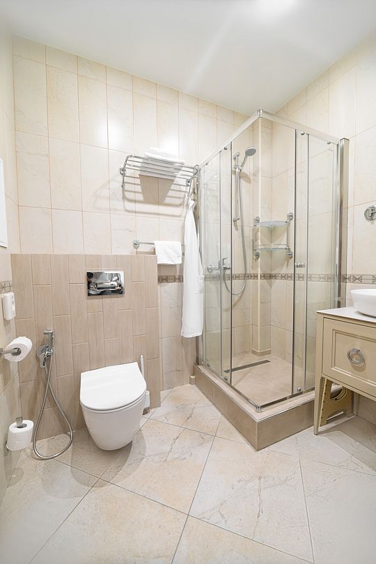 Ванные комнаты также не оставляют равнодушными — современные душевые кабины, глубокие раковины и роскошные туалетные принадлежности делают процедуру ухода за собой настоящим ритуалом благополучия.