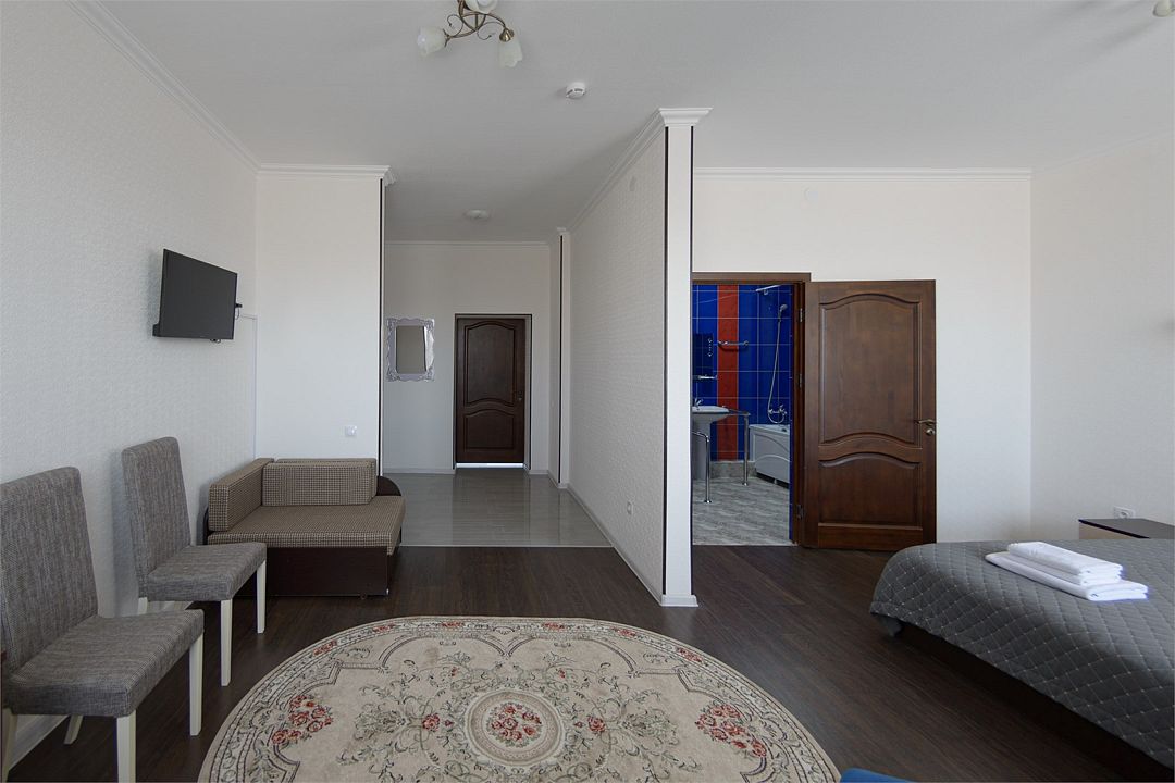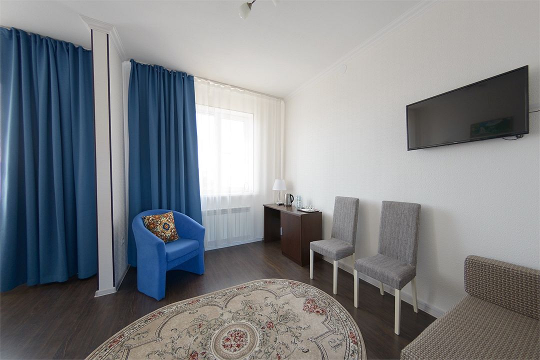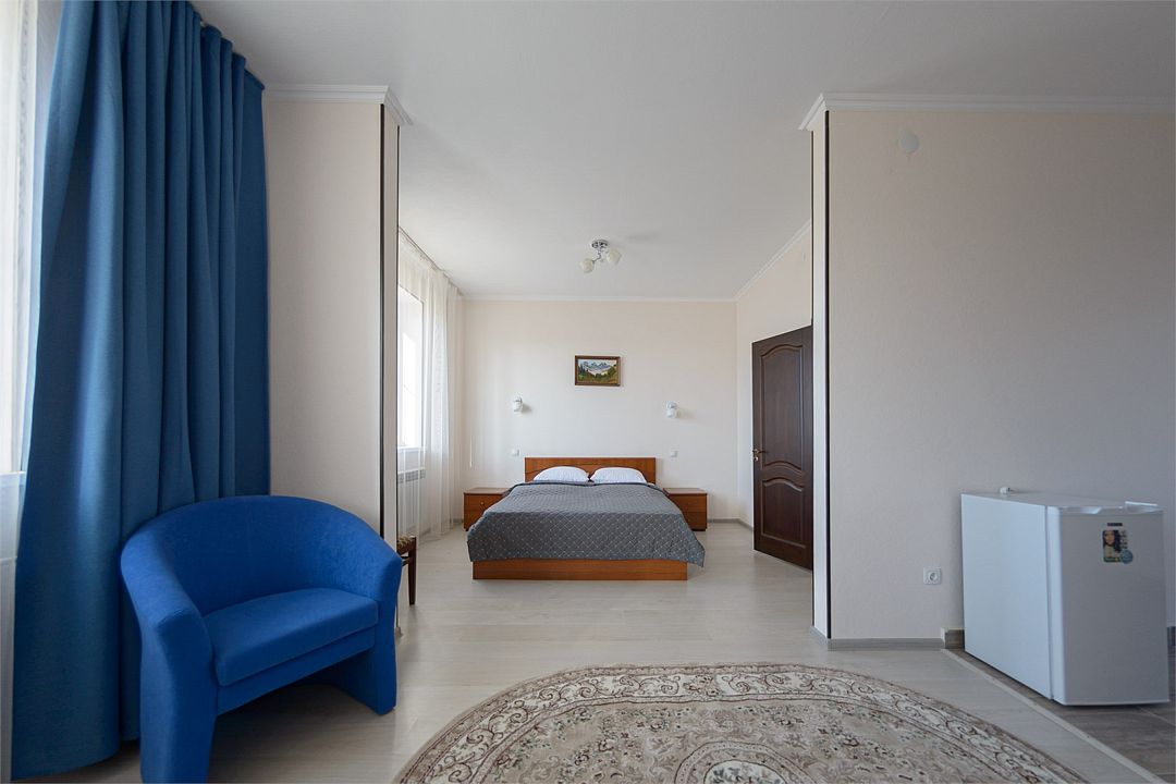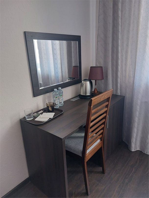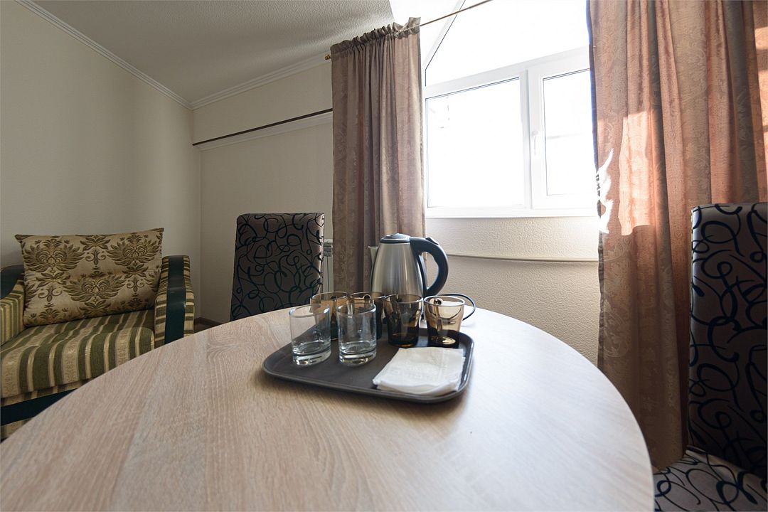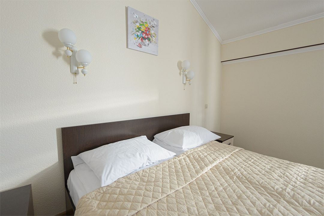 Номер также оснащен необходимой мебелью для приятного отдыха и комфорта, Wi-fi, кондиционер, письменный стол, стулья, полноценная просторная ванная комната, светильник, гостиничная парфюмерия, минеральная вода.